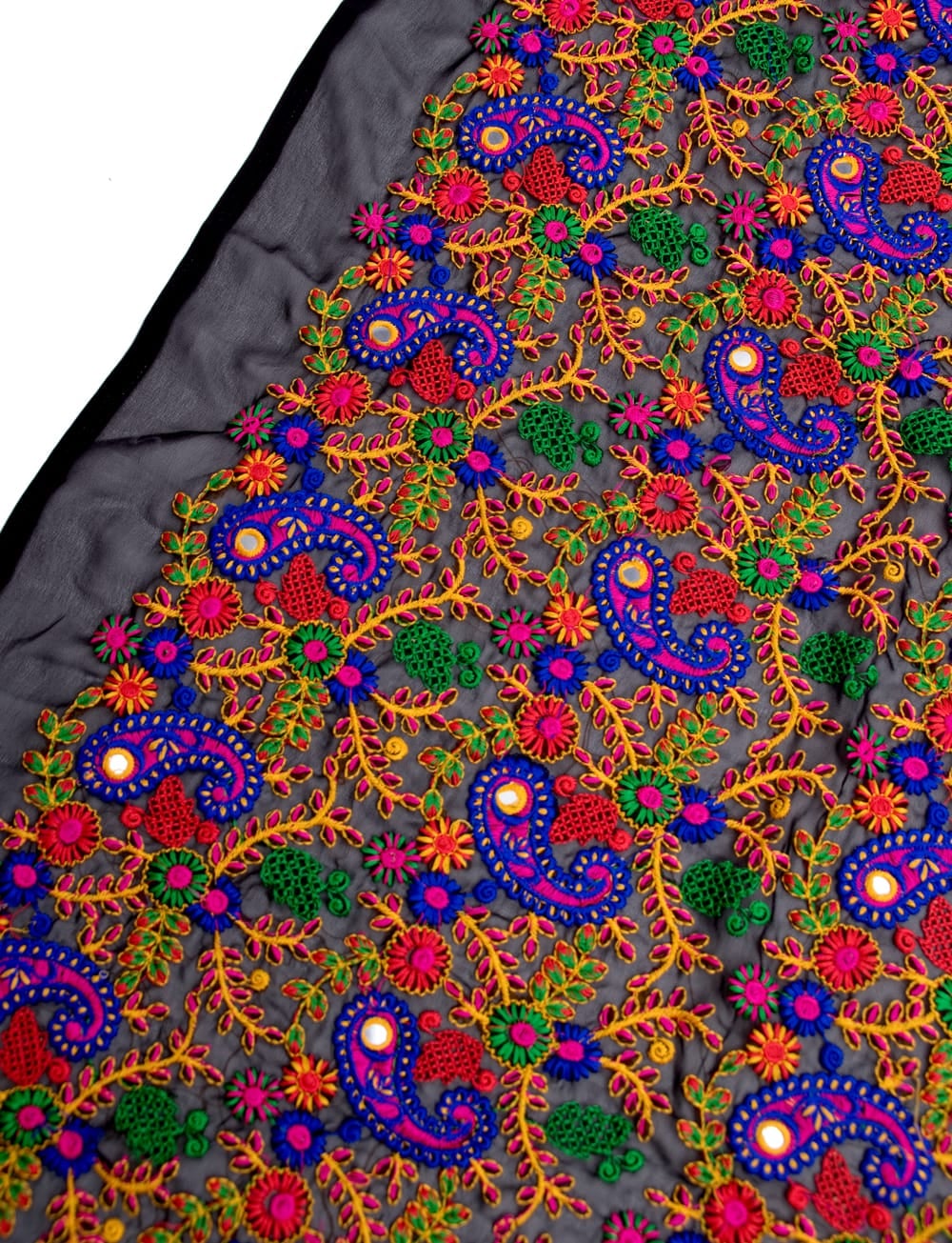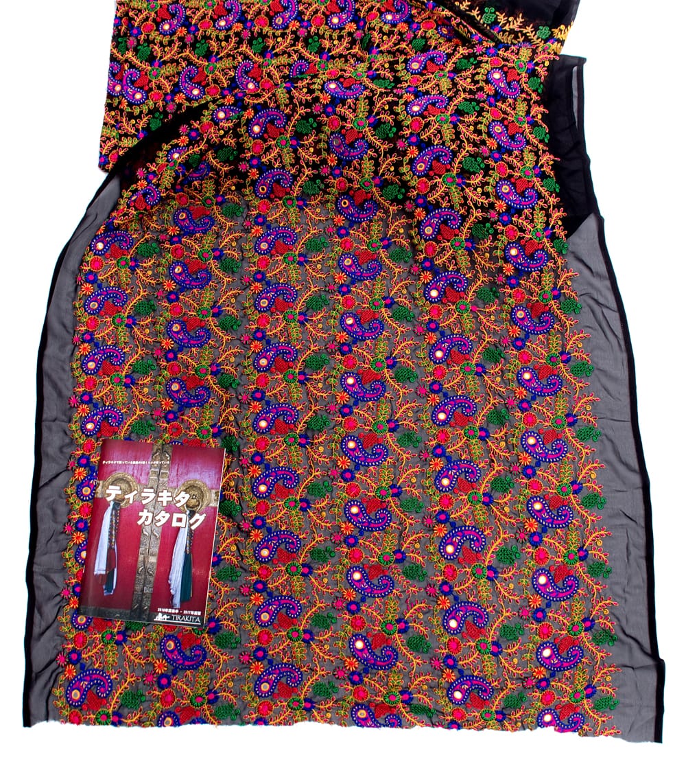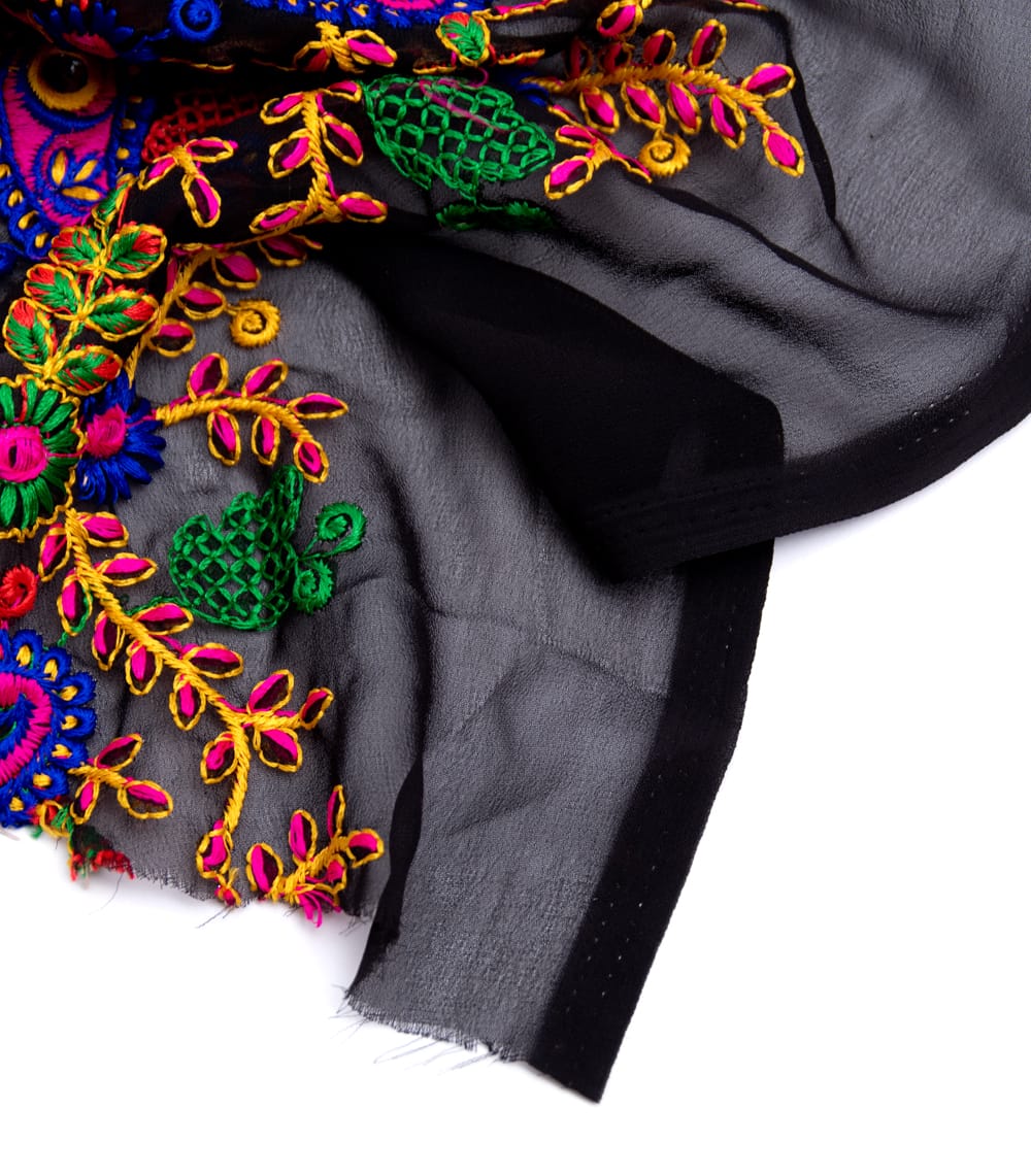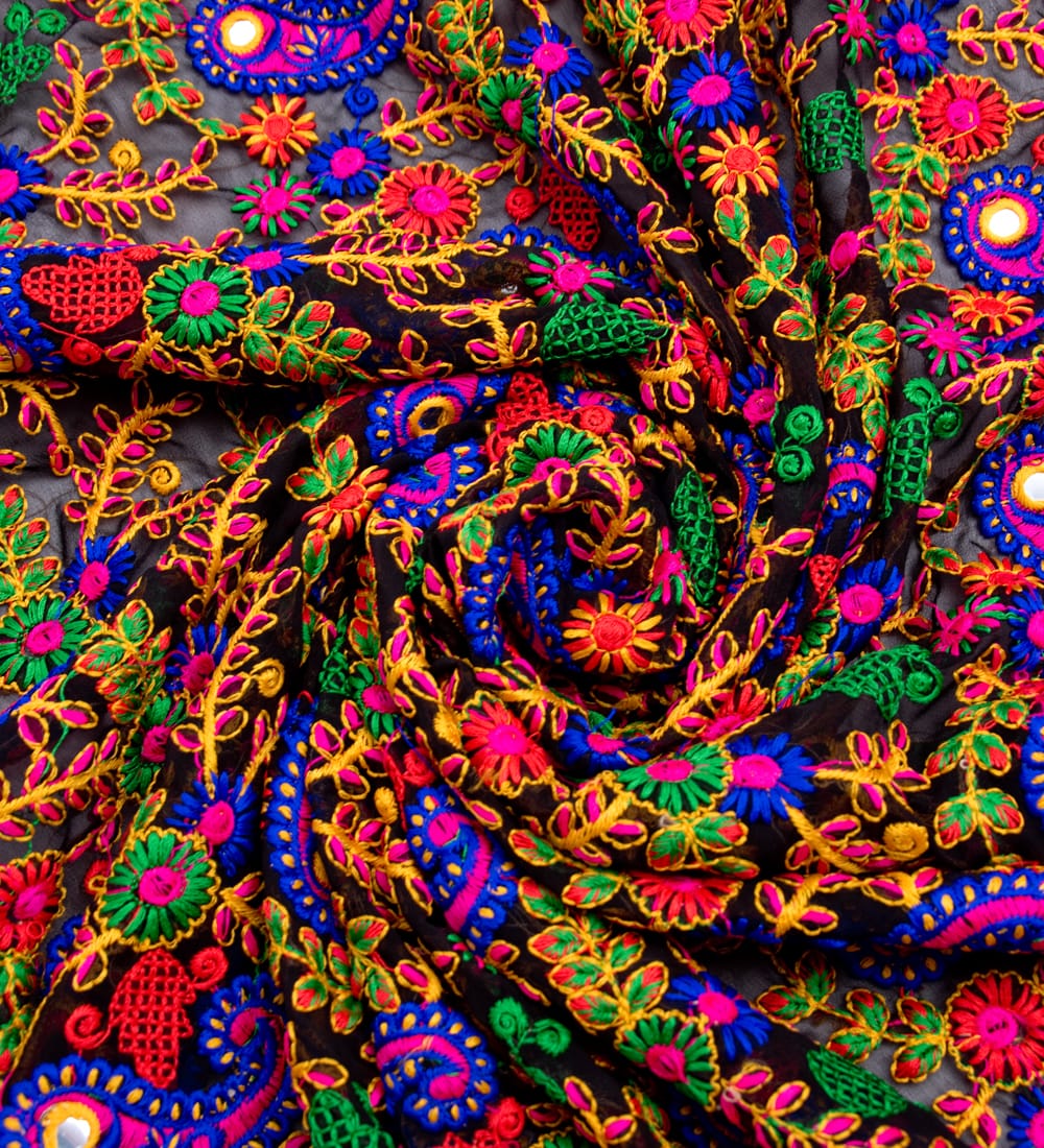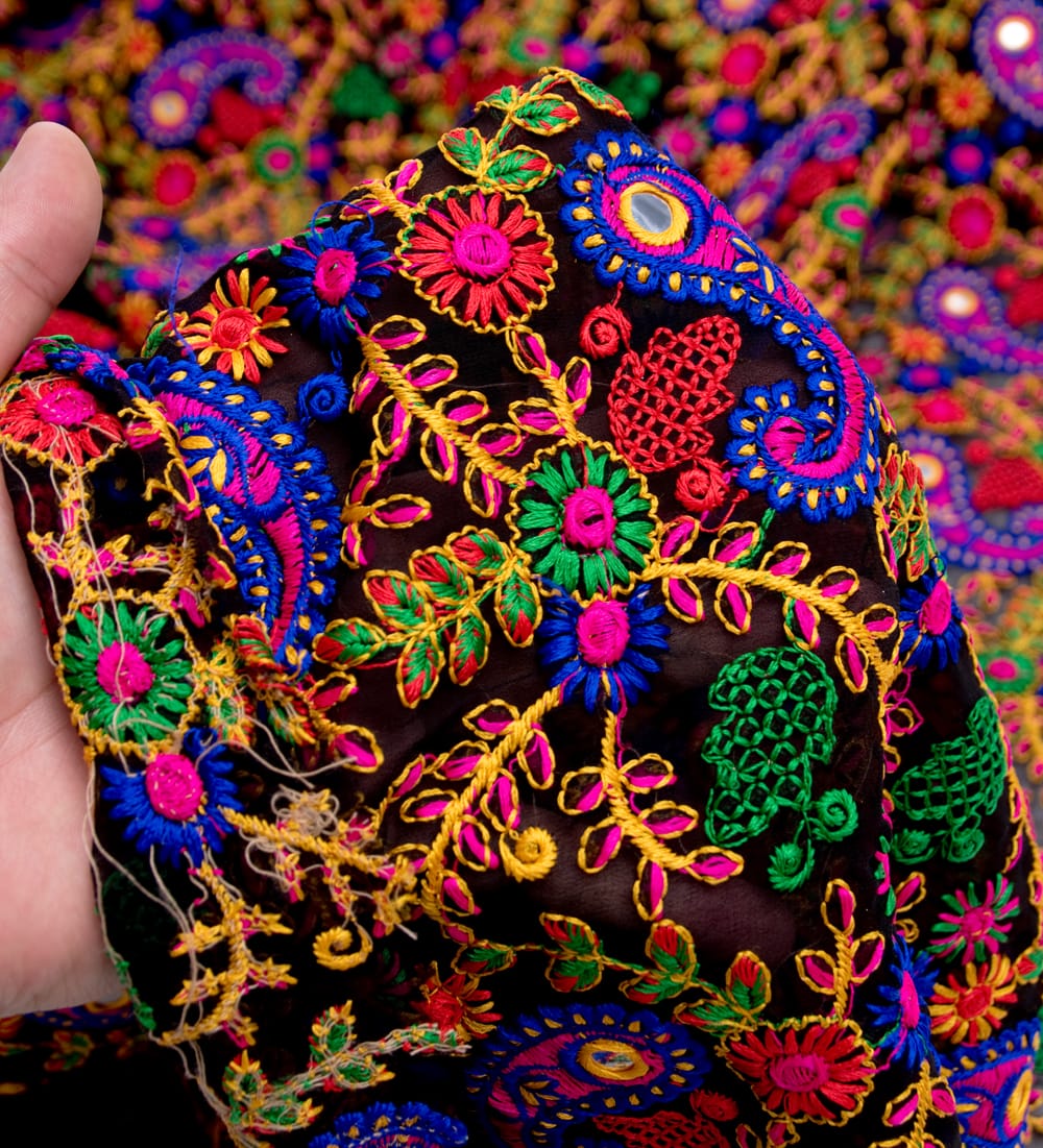 落ち着いた黒いメッシュ生地にインドらしい更紗やペイズリーのカラフル刺繍がマッチングしたレアな布です。メッシュカーテンとして用いたり、小物作りに用いたり、アイデア次第でさまざまな用途でお使いいただけますね。透ける質感がきれいですので、部屋の仕切りや壁飾りにしても素敵です。