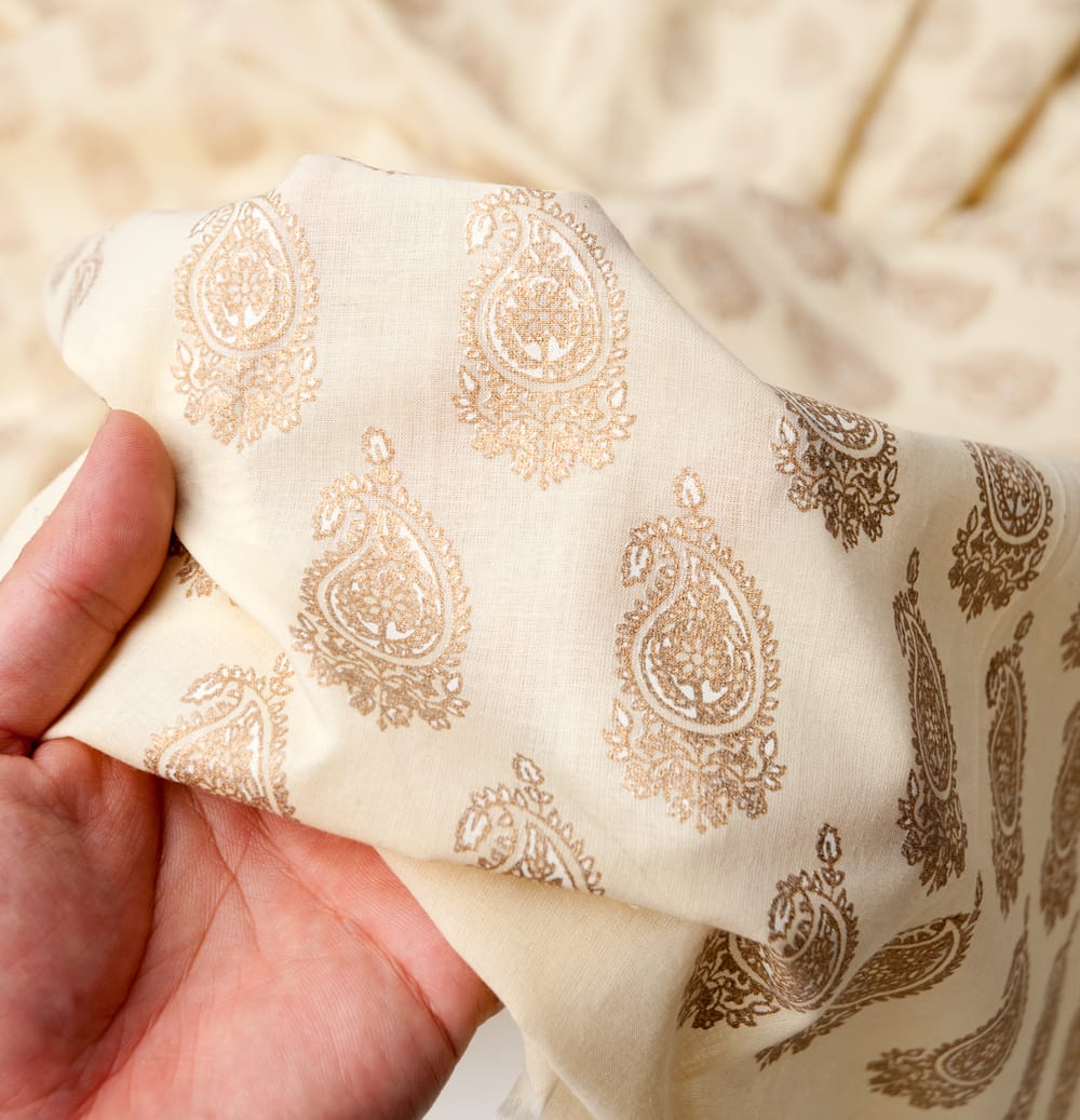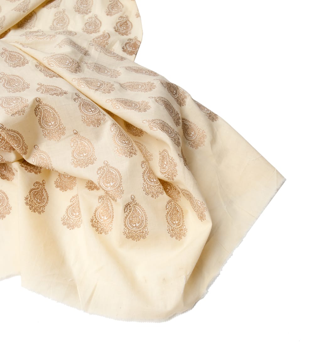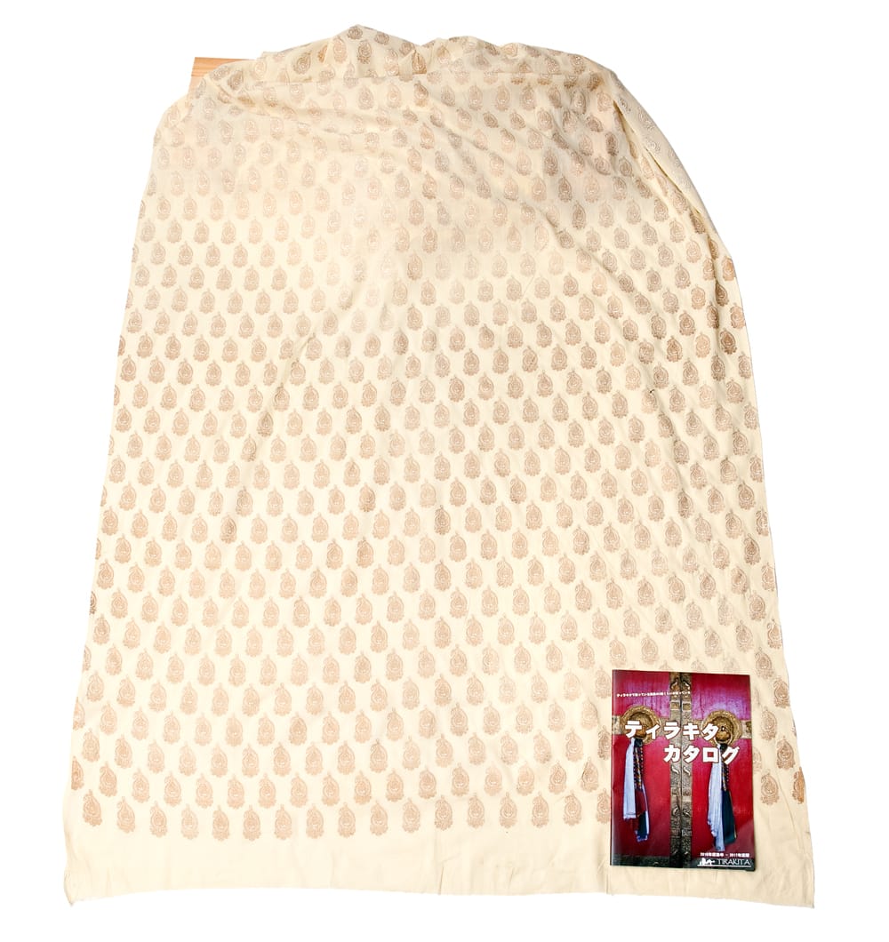 インドコットンに、インドの伝統模様を施した素敵な布です。布のベースカラーも、ホワイトやベージュなど落ち着いた色合いで、質感が良くとても雰囲気があります。手芸用の布としてはもちろんインテリア用のカバーや飾り布として様々な場所でお使いいただけます。ソファカバーやカーテン、等々色々な使いみちが考えられますね。