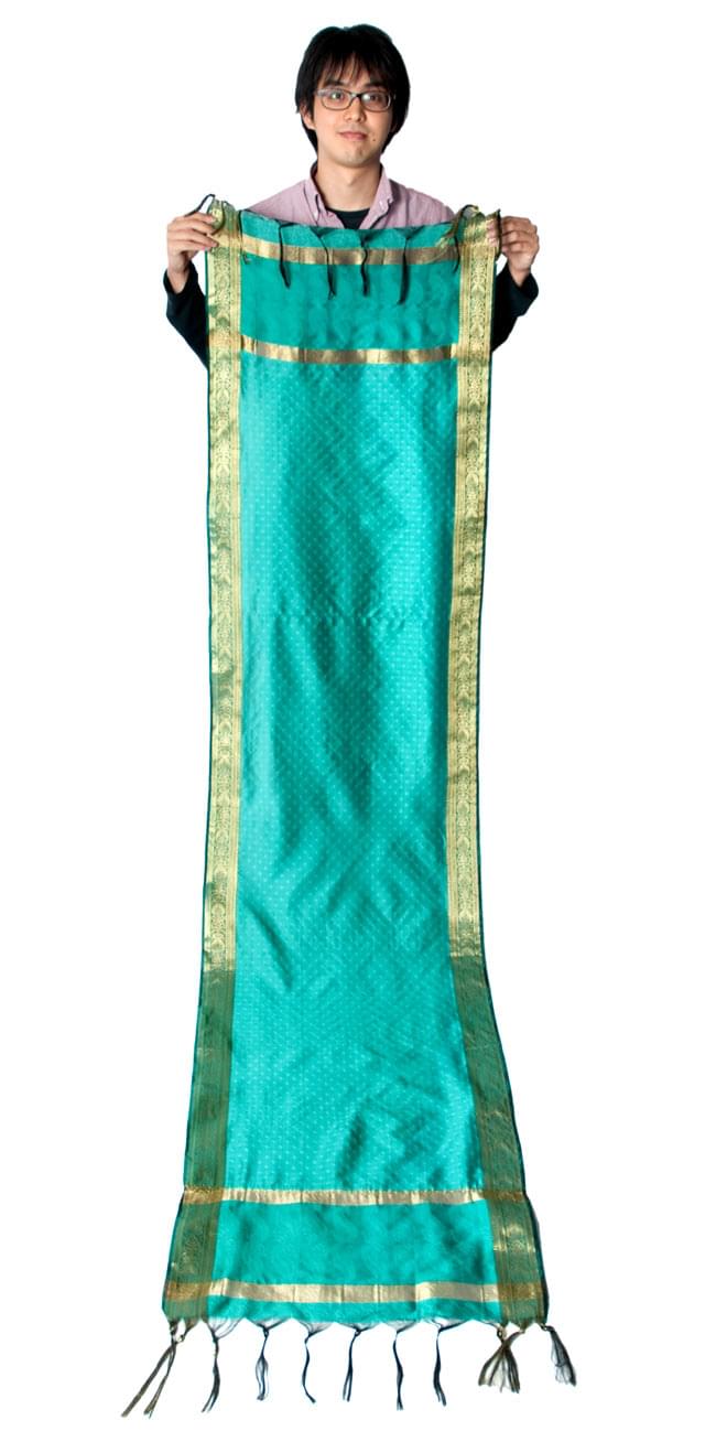 ボーダー入り 光沢スカーフ・デコレーション布 - 格子・エメラルドの写真ボーダー入り 光沢スカーフ・デコレーション布 - 格子・エメラルド 2 - 拡大写真です。光沢のある素材感で高級感があります。柄もインドらしくて素敵です。ボーダー入り 光沢スカーフ・デコレーション布 - 格子・エメラルド 3 - この生地の特徴は光沢感です!ツヤツヤとした触り心地で、陰影がハッキリと出るので、陽の光や照明にとっても映えます。ボーダー入り 光沢スカーフ・デコレーション布 - 格子・エメラルド 4 - 縁の部分の写真です。フリンジと布の色の組み合わせ綺麗です。ボーダー入り 光沢スカーフ・デコレーション布 - 格子・エメラルド 5 - 手でもってみたところです。光沢生地と金色の刺繍がとっても良い組み合わせです。ボーダー入り 光沢スカーフ・デコレーション布 - 格子・エメラルド 6 - 身長172cmの男性スタッフが持ってみました。大きさがわかりますね。
