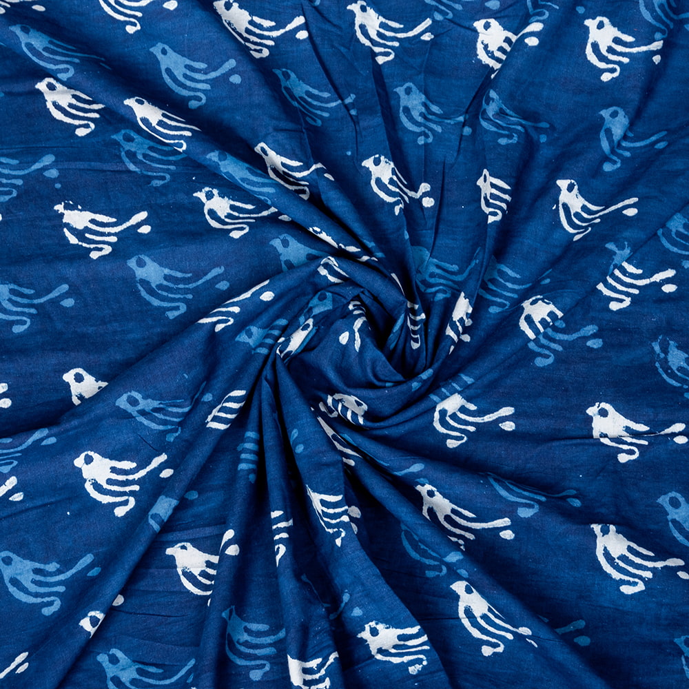 【5個セット】〔1m単位切り売り〕インドの伝統息づく 昔ながらの木版インディゴ藍染布 小鳥 ネイビー系〔幅約111cm〕