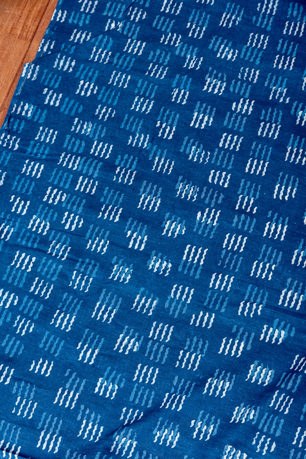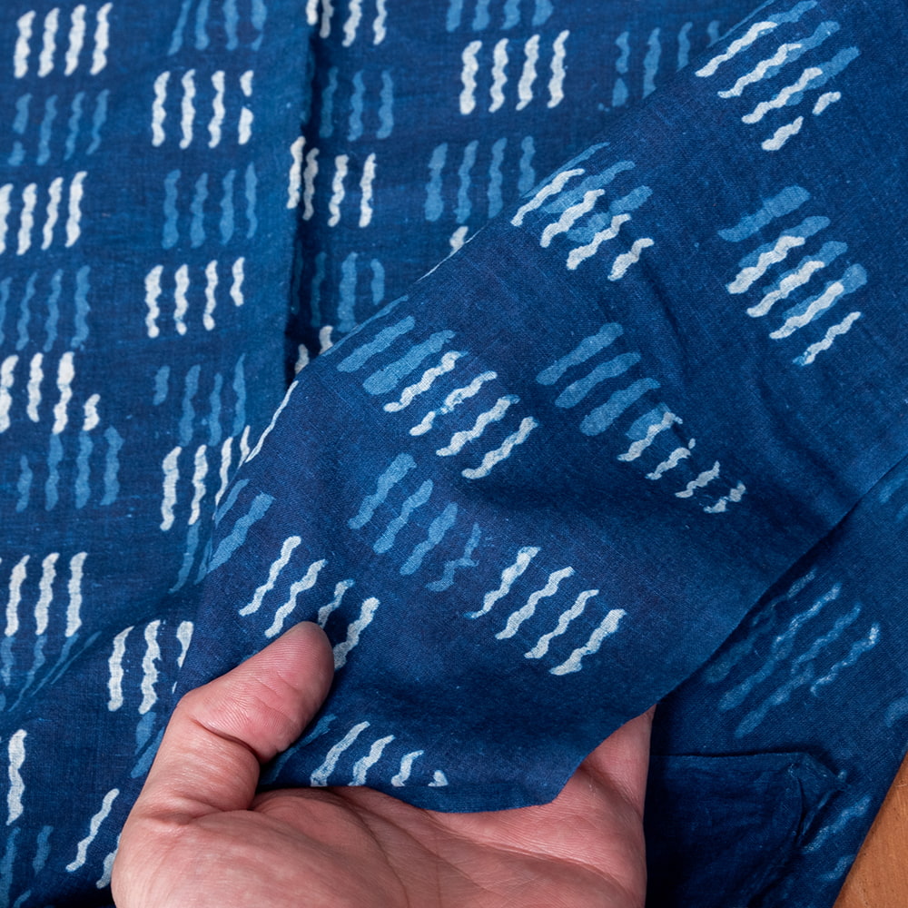 インドらしい伝統的な模様にインディゴの美しい青がマッチングした素敵な布です。泥染め(ダブプリント)によるシンプルなパターンの連なりと落ち着いた風合いは見ていて決して飽きることがありません。泥染めは、布地が染まるのを防ぐ泥状のペーストを模様が彫られたウッドブロック(木版)につけて布に押していきます。そして布につけたペースとへ、細かくなった小麦の籾殻を撒きます。そうすると小麦の皮が先ほどの泥にくっついてくれるので天日干しします。