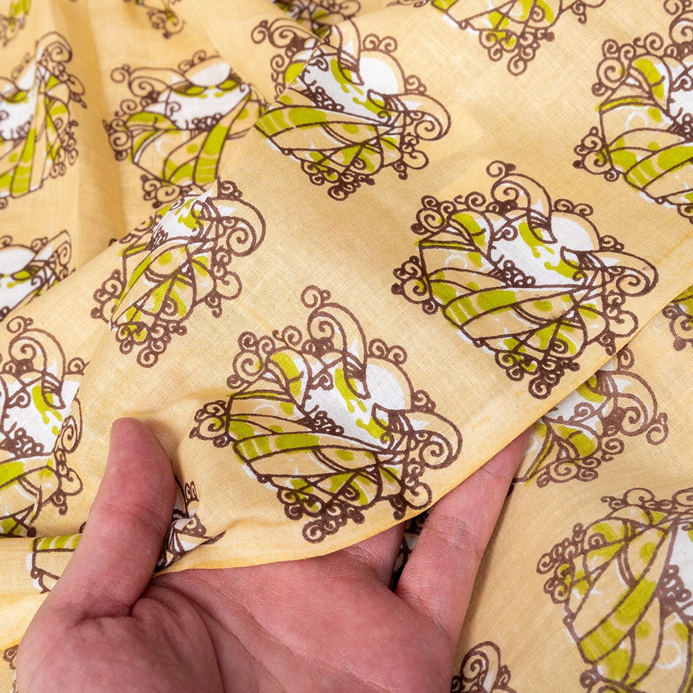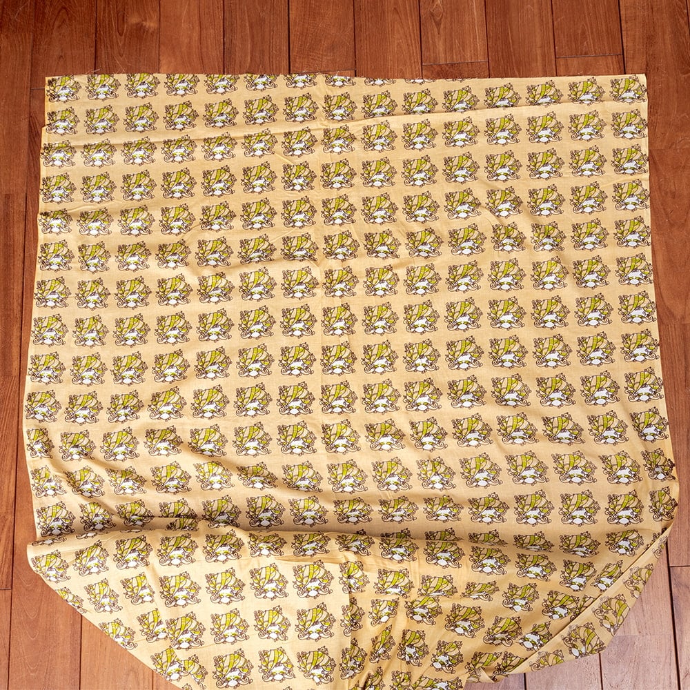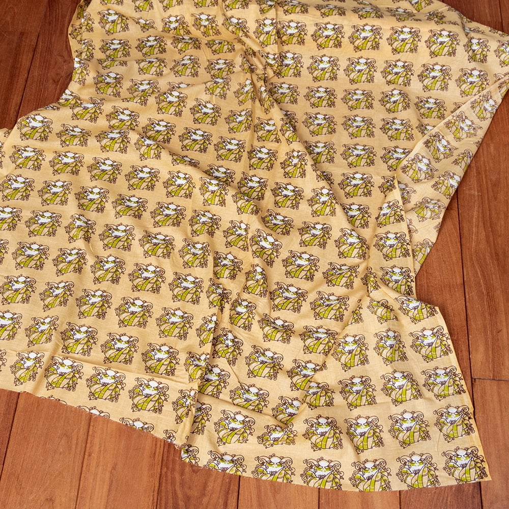 ひたすらブッダのお顔が並んだデザインや、仏さまの印相、ヒンドゥー教の神様やインド・ラジャスタン州の、伝統的なターバンをかぶったインド人をモチーフにした物など、インドにしかない独特な切り売り布です。布いっぱいに顔が並んでいたり、ハートの形をした菩提樹の葉の上に、ブッダの顔がひたすらあったりと、いまだかつていないデザイン。色彩もレトロ調だったり、ちょっとサブカルな雰囲気も感じますが、どこか癖になるかわいさのある布たちです。