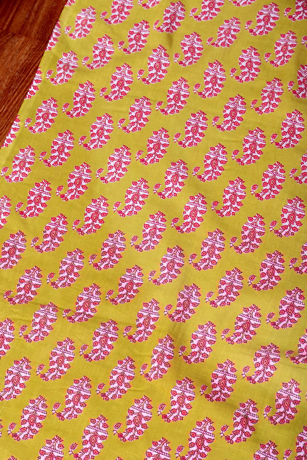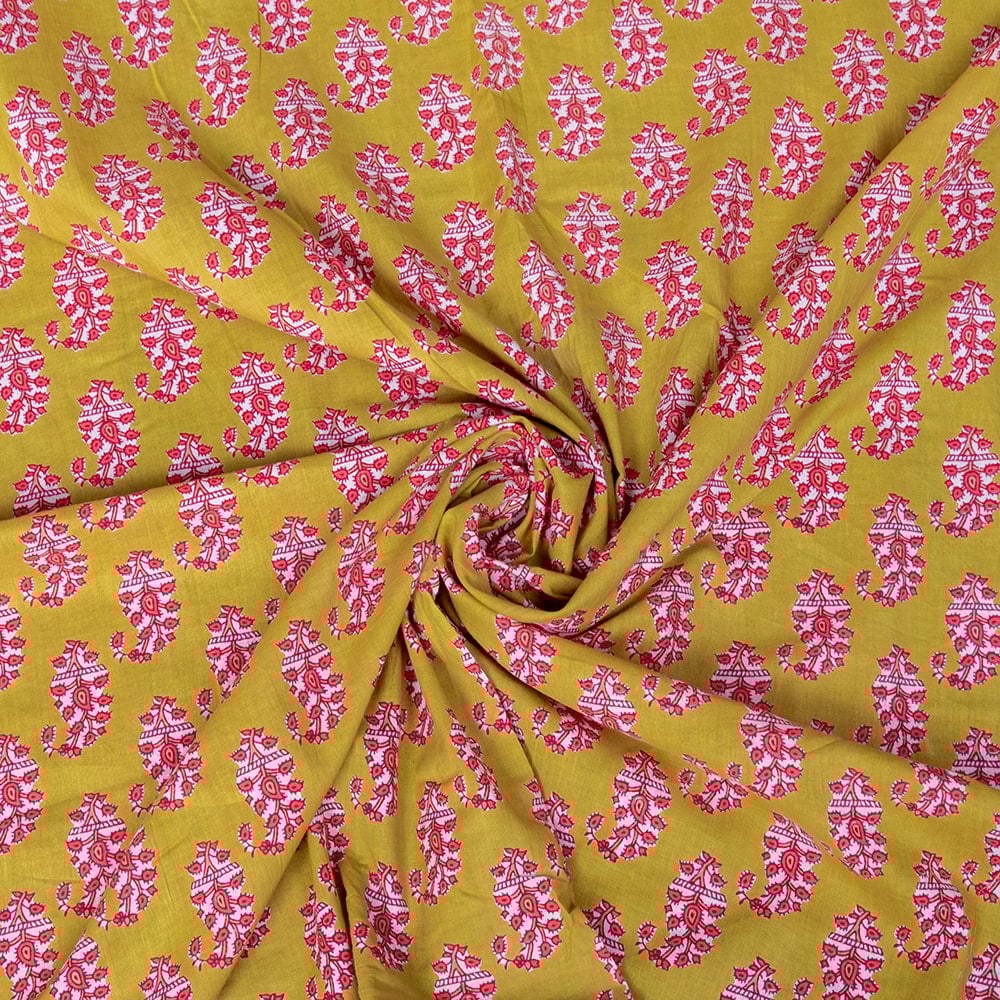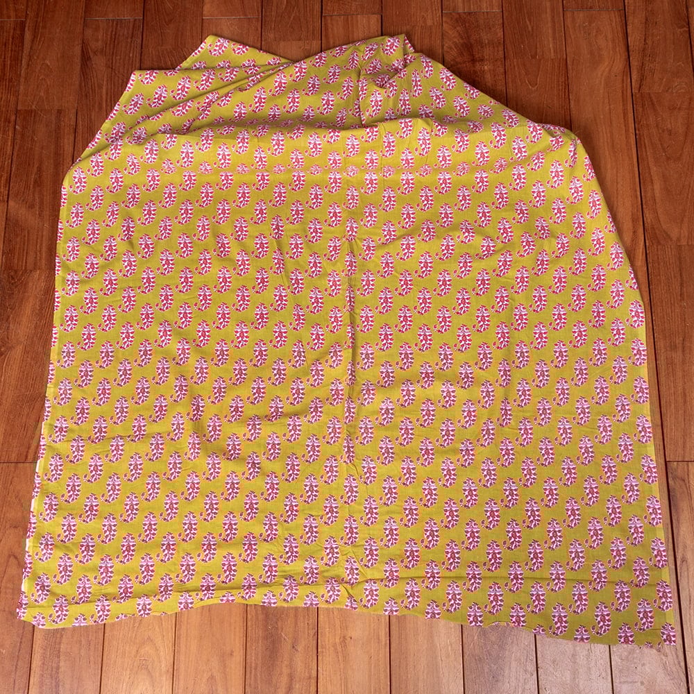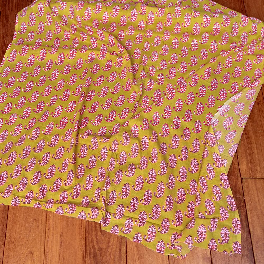 〔1m単位切り売り〕南インドの民族模様 昔ながらのペイズリー布 黄緑系〔幅約109cm〕 x 5個