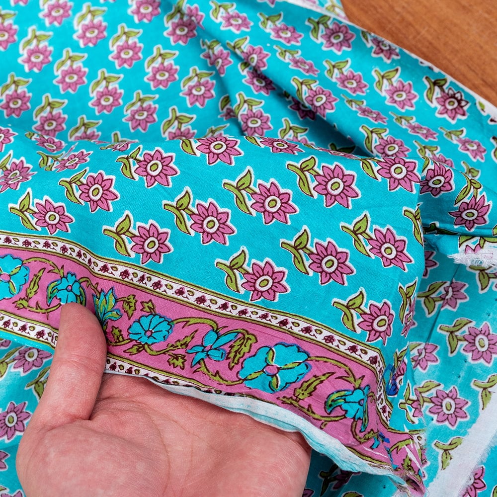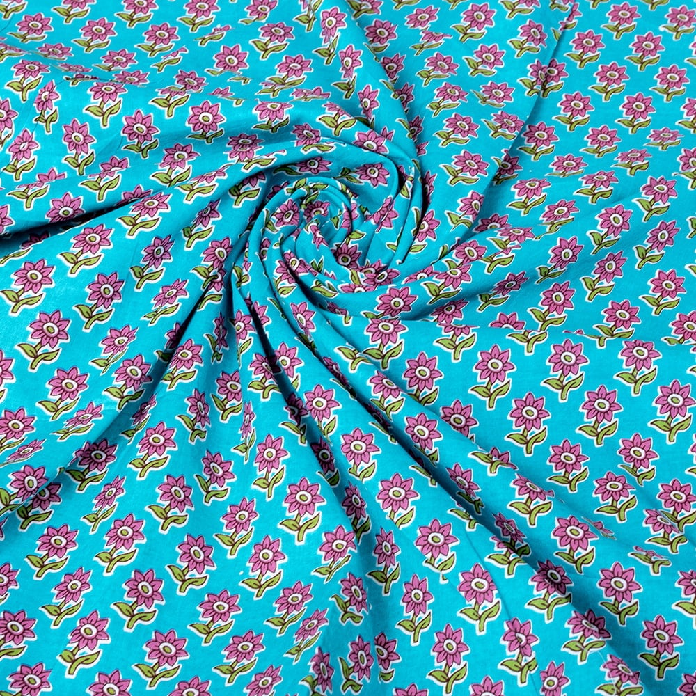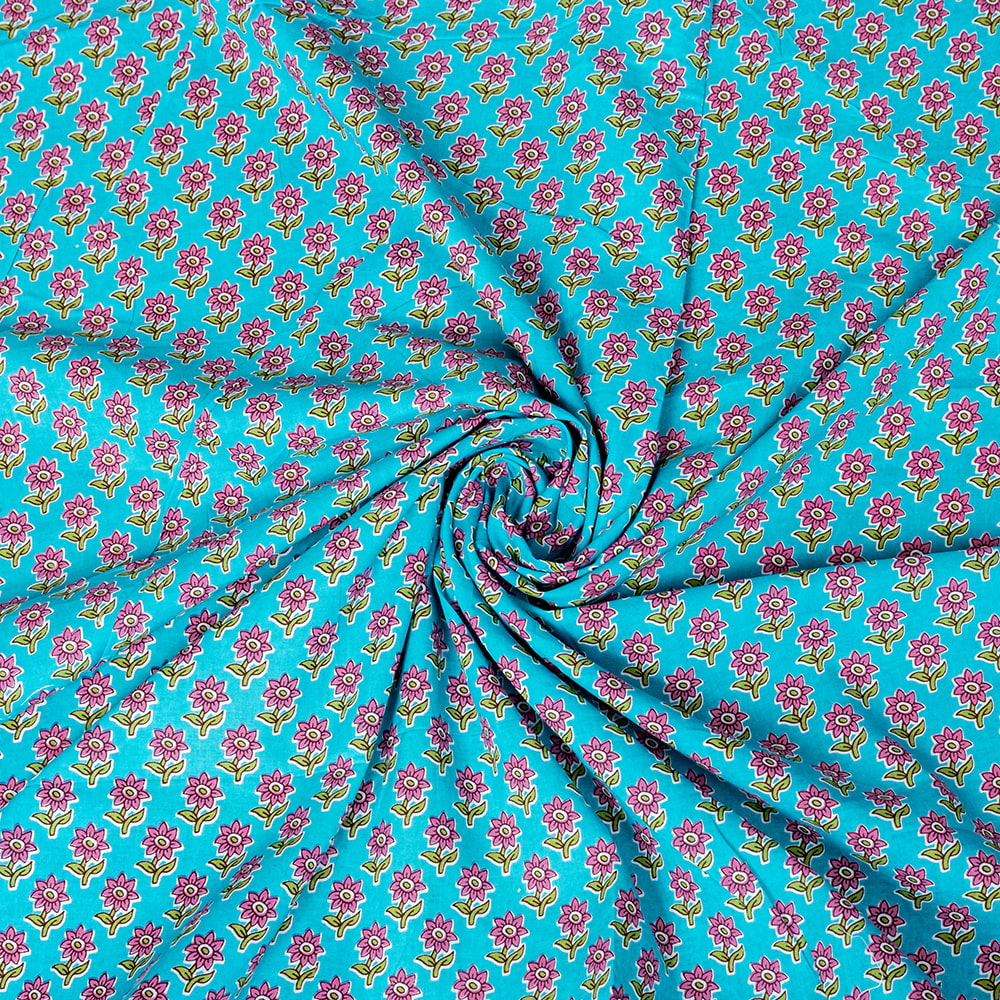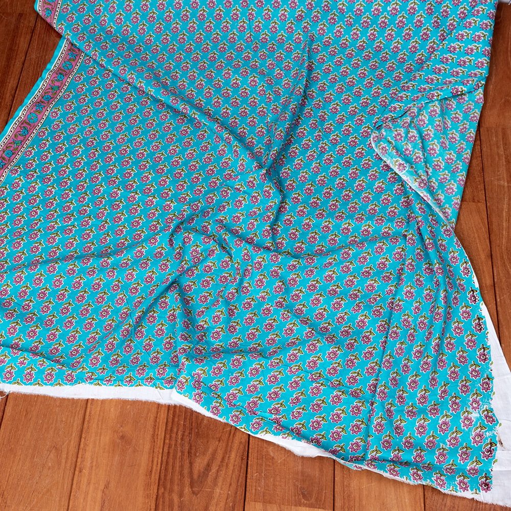 〔1m単位切り売り〕テキスタイルの伝統息づくインドから 昔ながらの小花柄布 青緑系〔幅約111cm〕 x 5個