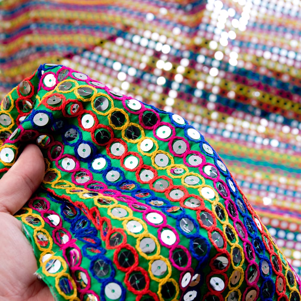 光沢感ある生地に、光り輝くスパンコールを散りばめた美しい布です。インドらしい煌きが美しく、飾り布として様々な場所でお使いいただけます。シンプルに壁などを飾るにも素敵ですし、手持ちの衣類やカバンなどをグレードアップしたり、ベリーダンスの衣装などステージアイテムを作るのも素敵です。■便利な計り売り!