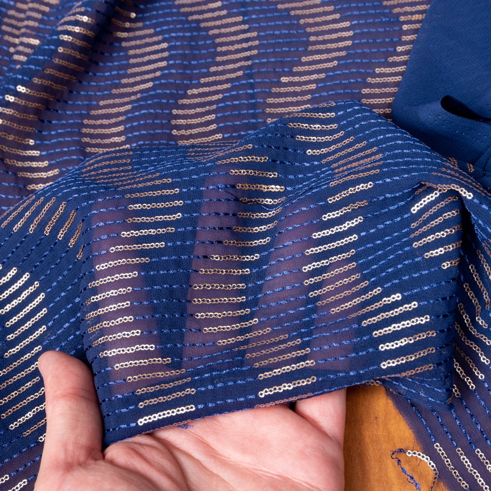 【5個セット】〔1m切単位り売り〕インドのスパンコール刺繍付き シフォン生地布〔約106cm〕ネイビー系