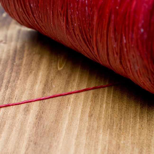 ワックスコード - 蝋引き糸 - 440g - 赤[2番 標準]の商品写真 3枚目 質感がわかるように近寄ってみました。蝋でコーティングされているので、とてもしっかり丈夫なのがわかります。たまにロウの塊がありますが問題ありません。