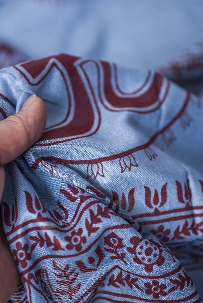 さらさらふんわりのレーヨン生地で作られたラムナミは、ひんやり気持ちい肌触り。一度触ると肌身離したくなくなるような感じです。夏は日よけのショールに、冬場はマフラーなどにと使い方は様々。大きさもしっかりとしているので、お部屋の壁飾りなどとするとガラッと雰囲気が変わり、そこはもうインドになりますよ。