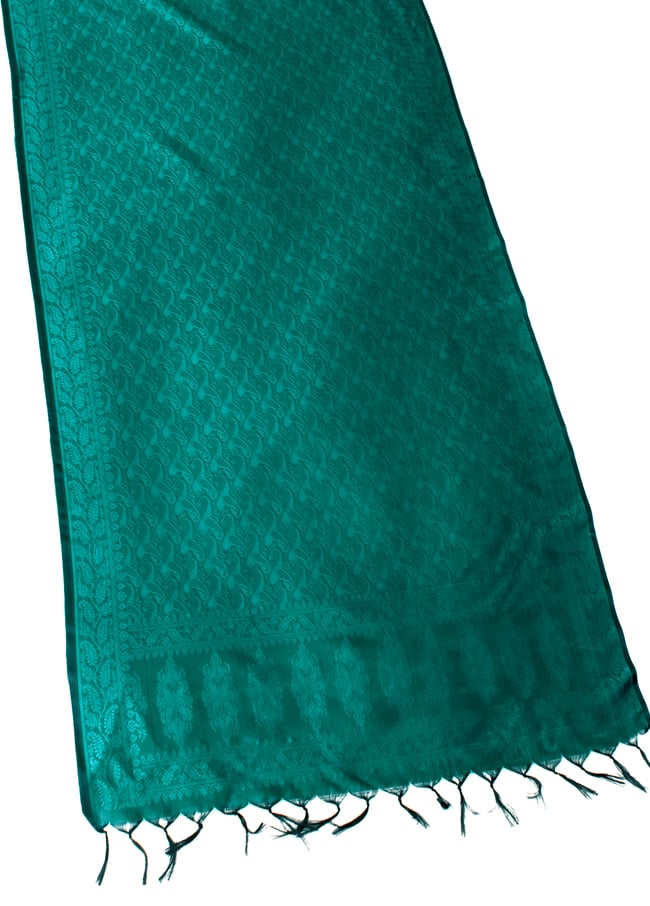 光の角度によって模様が浮き出る、インドの伝統模様「ペイズリー」柄のスカーフサイズのファブリックです。シルクに似た質感と光沢で、光のあたる角度によって様々な光沢を見せます。大きさは約195cmX54cm程度(*手作りの為、個体差があります。)と細長い長方形です。■装飾用の布地として