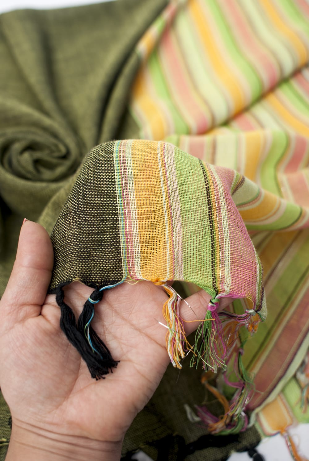 伝統のあるインドのコットン生地をカラフルに織り込んだストールサイズの布です。インドの聖地、バラナシからやってきました。軽やかで滑らかな手触りが心地よく、思わず何枚も揃えたくなる布です!色彩感覚豊かなインドらしく、綺麗な配色で多くの色合いがあるので、色次第で季節感も出せる一枚です。決して派手すぎないパステルカラー寄りの明るい色合いなのも春先などにぴったりですね。大きさは全部広げると身体がすっぽり隠れるくらいの大判サイズ。ふんわりした布なので、くるくるとストールとして使っても心地良いです。