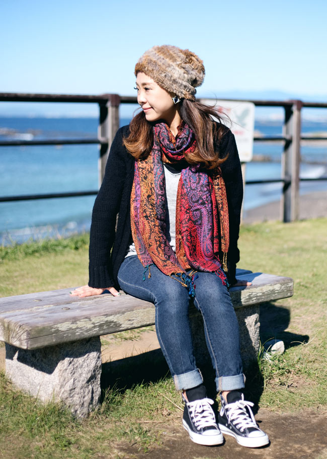 暗めなアウターが多くなってしまう季節も、インドらしい明るい雰囲気のストールが素敵な差し色になります。
