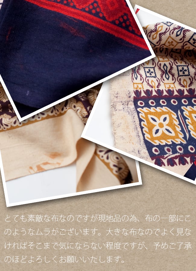 | 備考 | 現地品となりますので、一部に写真で掲載させていただいたような染料の飛び等ムラがございます。裁断により若干それぞれサイズに個体差がある場合がございます。また、フチの一部が切りっぱなしの状態になっております。染料の関係上、摩擦や水濡れにより色落ちすることがございますので、明るい色の衣料などへの色移りにはお気をつけ下さい。 |