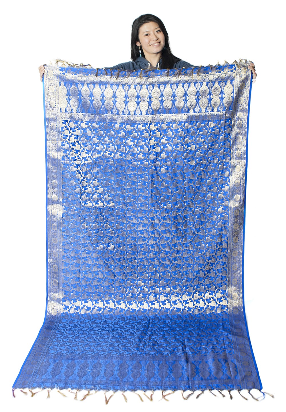 インドの伝統模様のペイズリーや唐草、格子模様の大判布です。光のあたる角度によって様々な光沢を見せてくれます。大きさは約220cm×約110cmと太く長い形をしています。