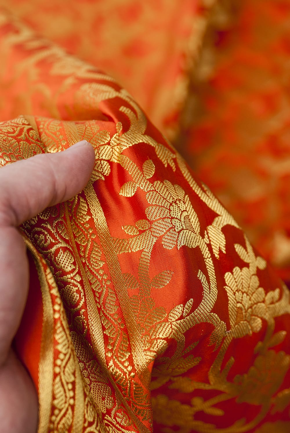手でもってみたところです。光沢生地と金色の刺繍がとっても良い組み合わせです。