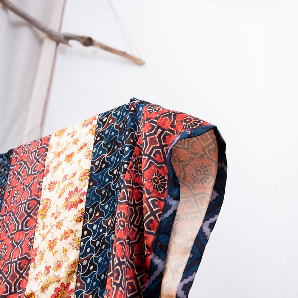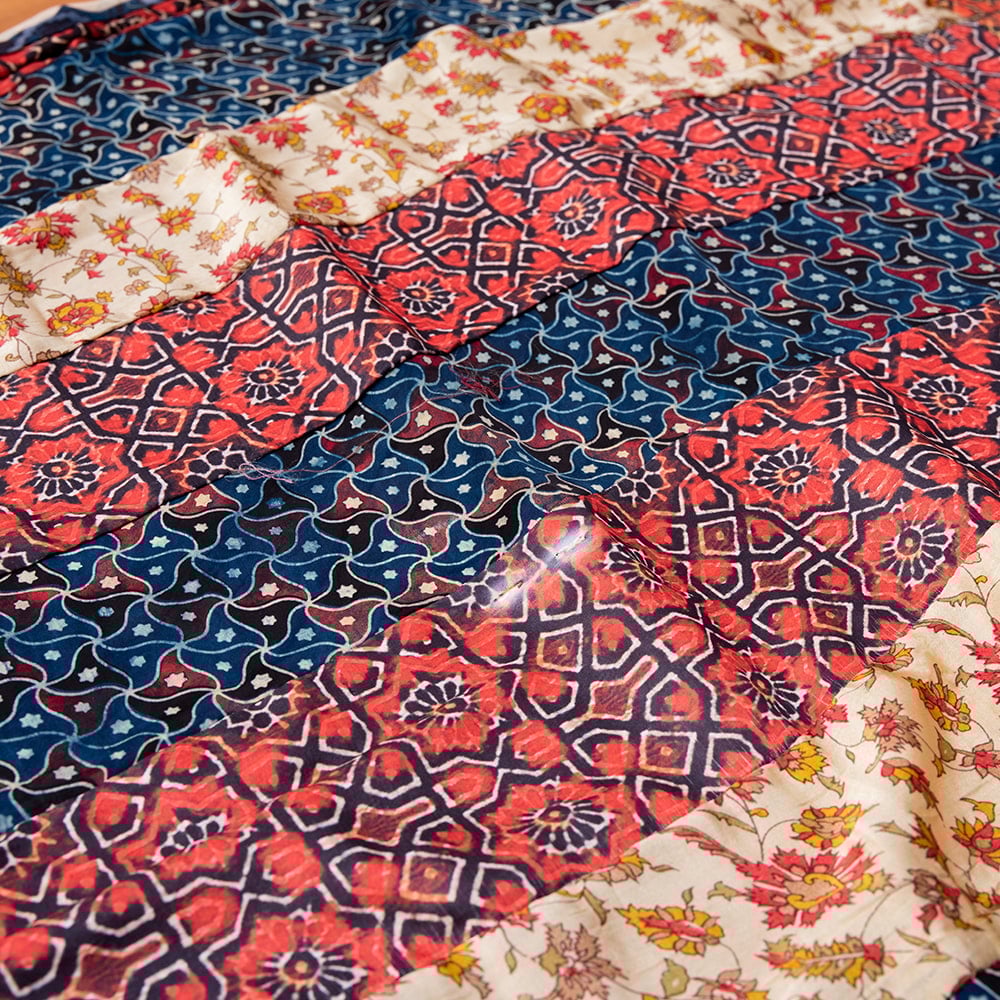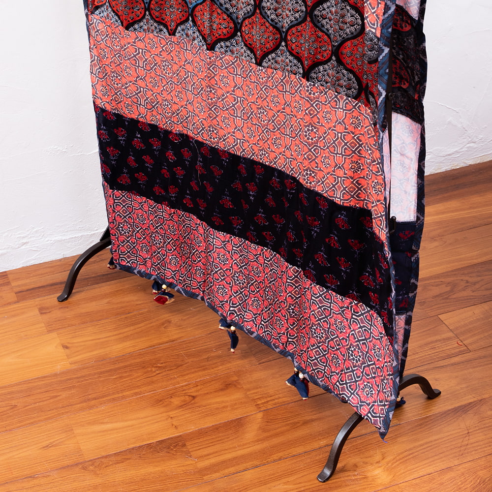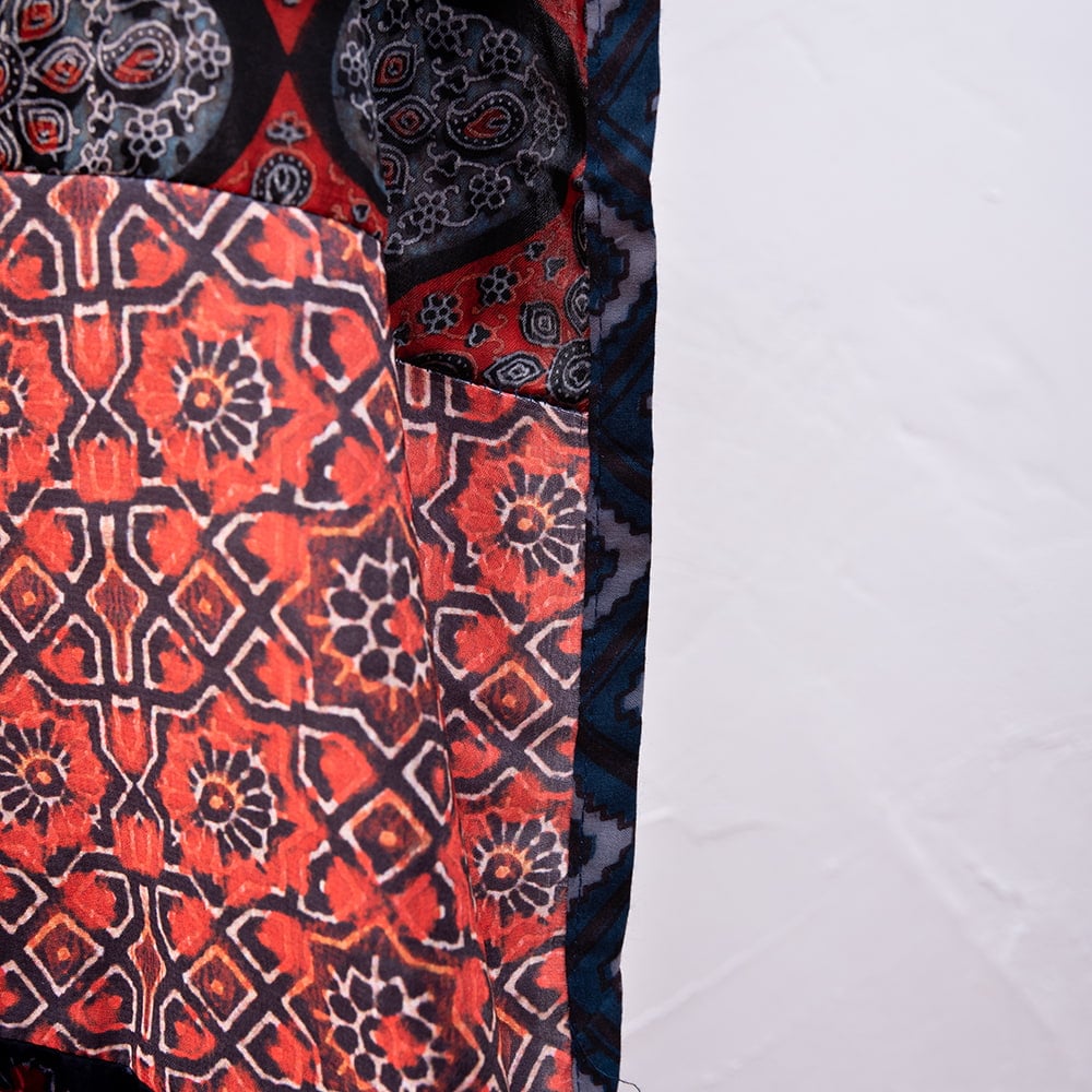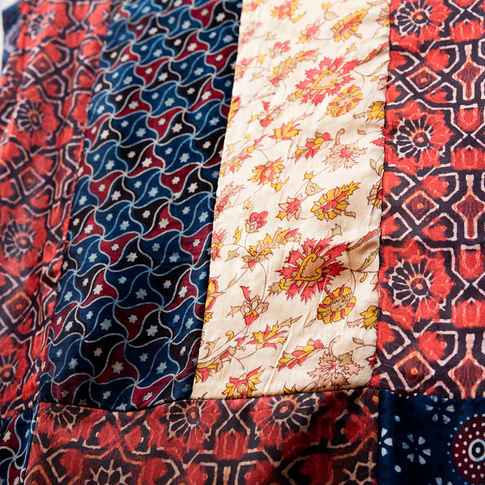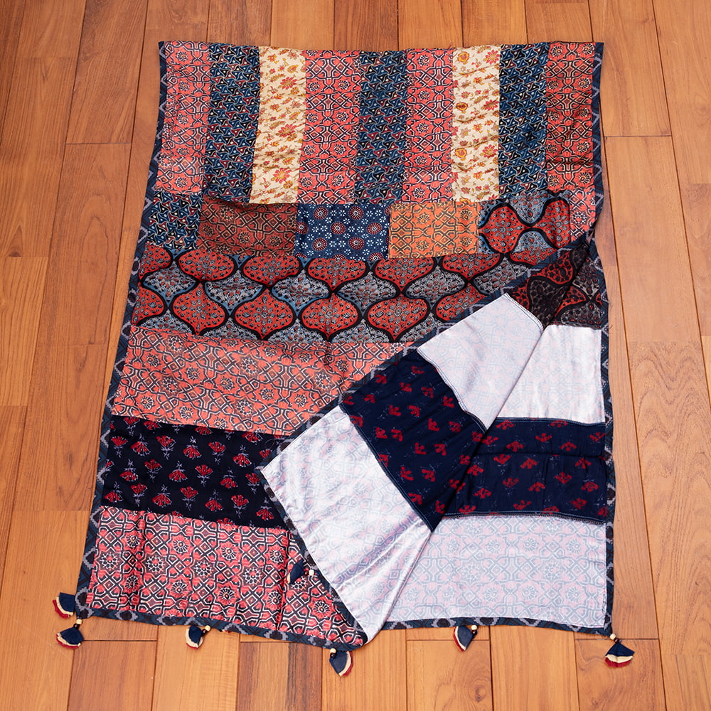 アジュラックプリントやカラフルな生地を組み合わせてできたドゥパッタはすべて1点もの。生地職人がまっさらな生地にアジュラックプリントを施し、美しい生地を完成させます。出来上がった生地は縫製職人に渡り、手作業でパッチワークを作り上げています。トーンを抑えた色味、真ん中を中心に左右対称に配置された柄のおかげで、見た目よりもコーディネートしやすく使いやすいです。