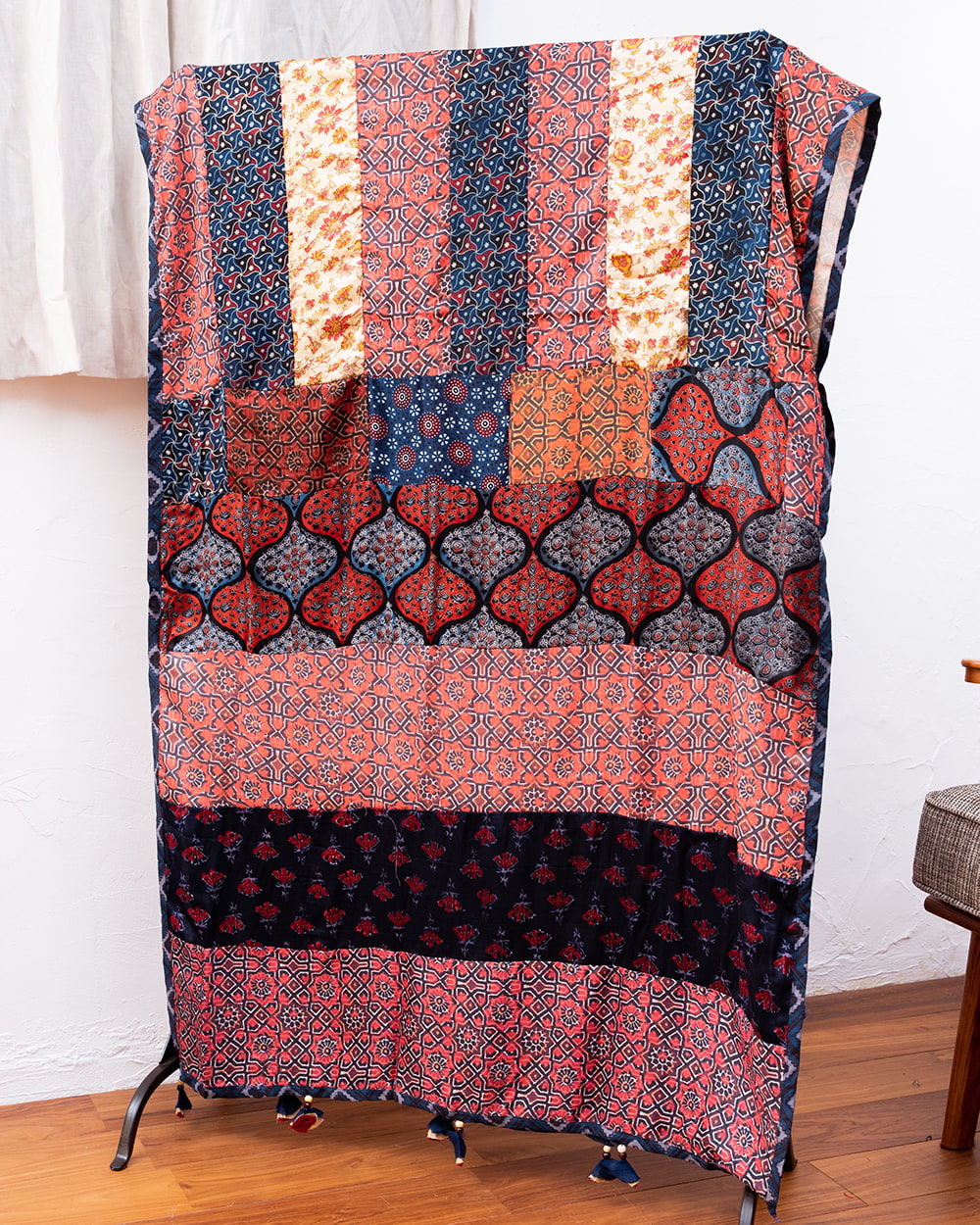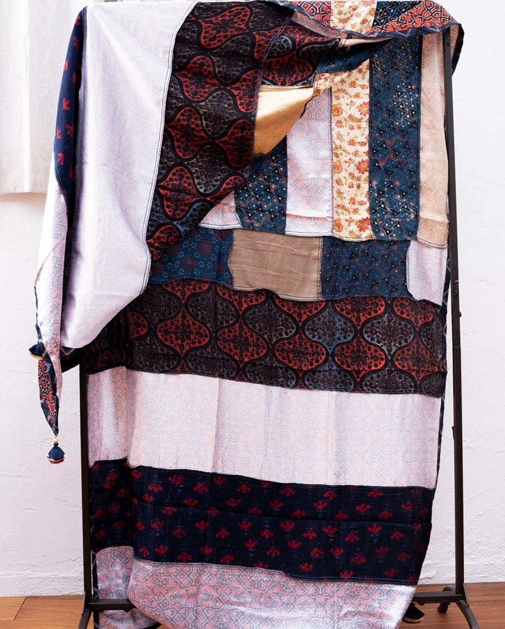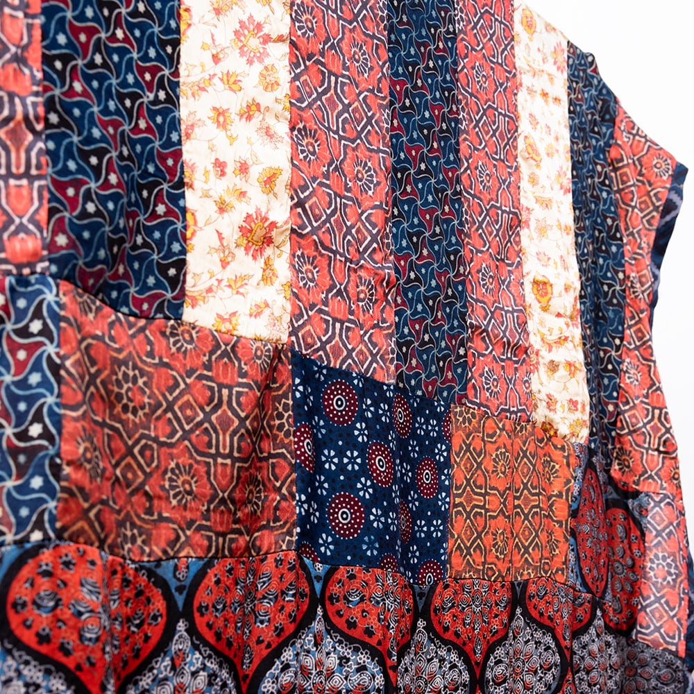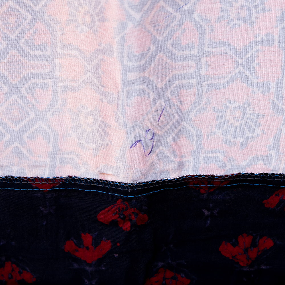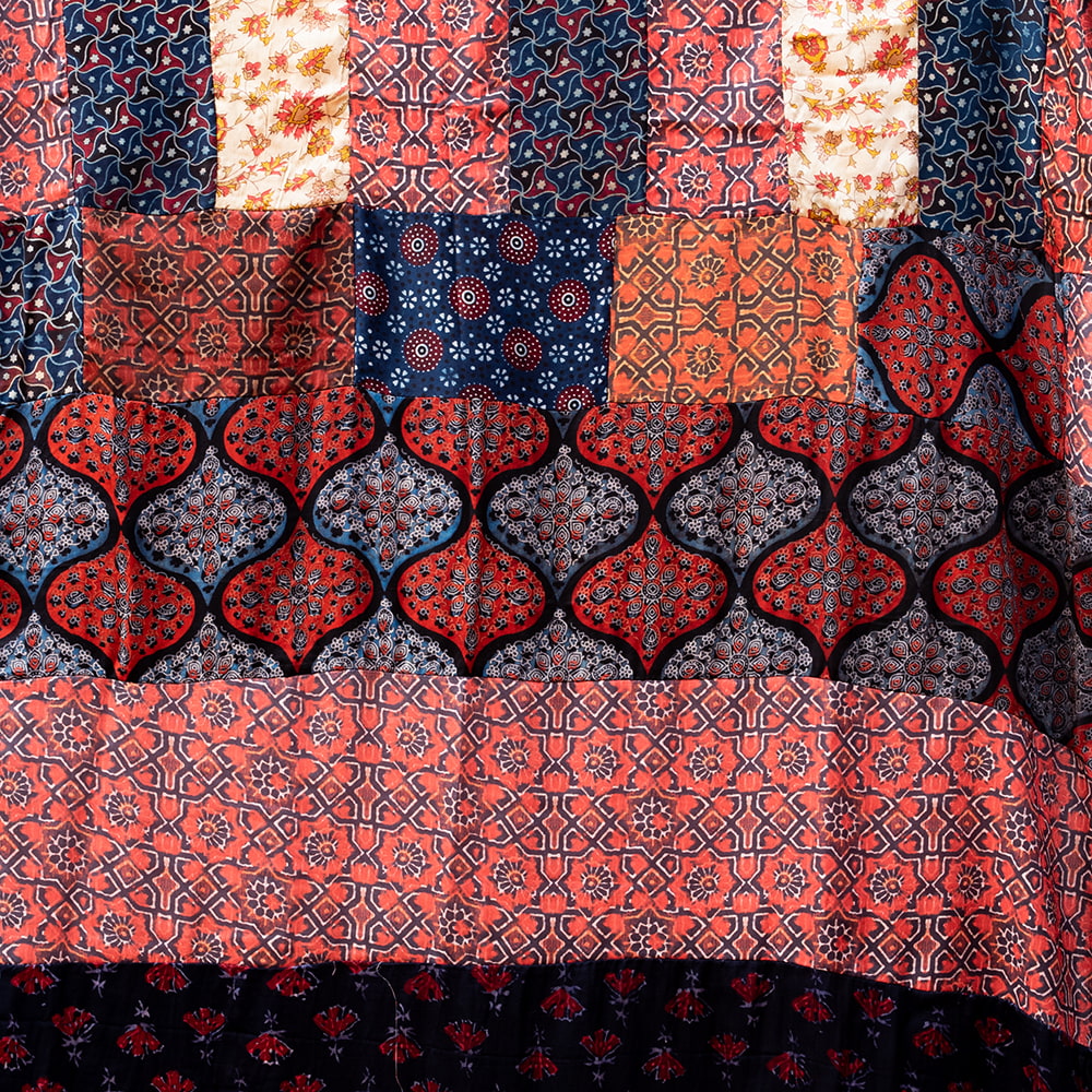 アジュラックプリントやカラフルな生地を組み合わせてできたドゥパッタはすべて1点もの。生地職人がまっさらな生地にアジュラックプリントを施し、美しい生地を完成させます。出来上がった生地は縫製職人に渡り、手作業でパッチワークを作り上げています。トーンを抑えた色味、真ん中を中心に左右対称に配置された柄のおかげで、見た目よりもコーディネートしやすく使いやすいです。