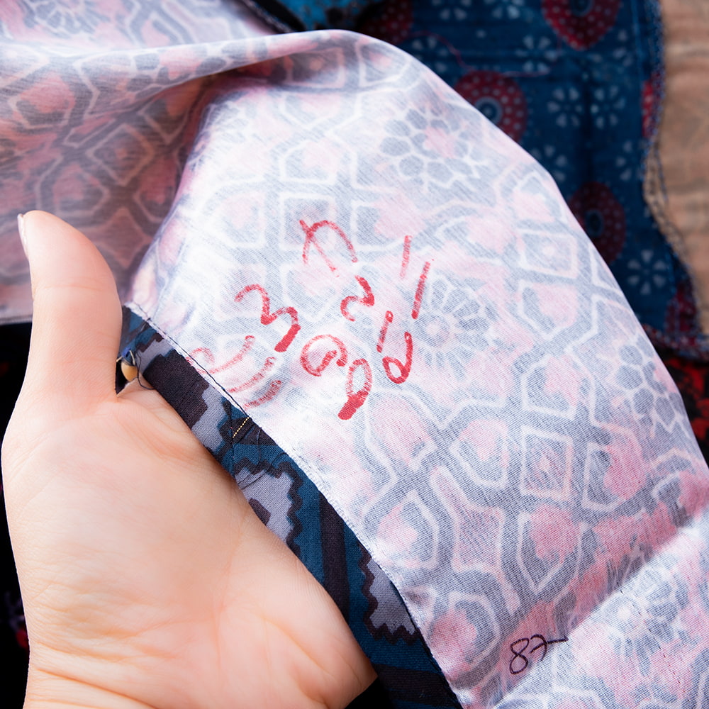 1点1点手作業で布を染め上げ仕上げているため、インク飛びや糸つれ、色擦れ、プリントずれなどがございます。工業製品にはない味としてお楽しみください使われた生地により、色落ちがあるものがございます。伝統的な染色方法で作られている布の場合、現代の洗濯機と洗剤で洗うスタイルに適していないものもございます。
