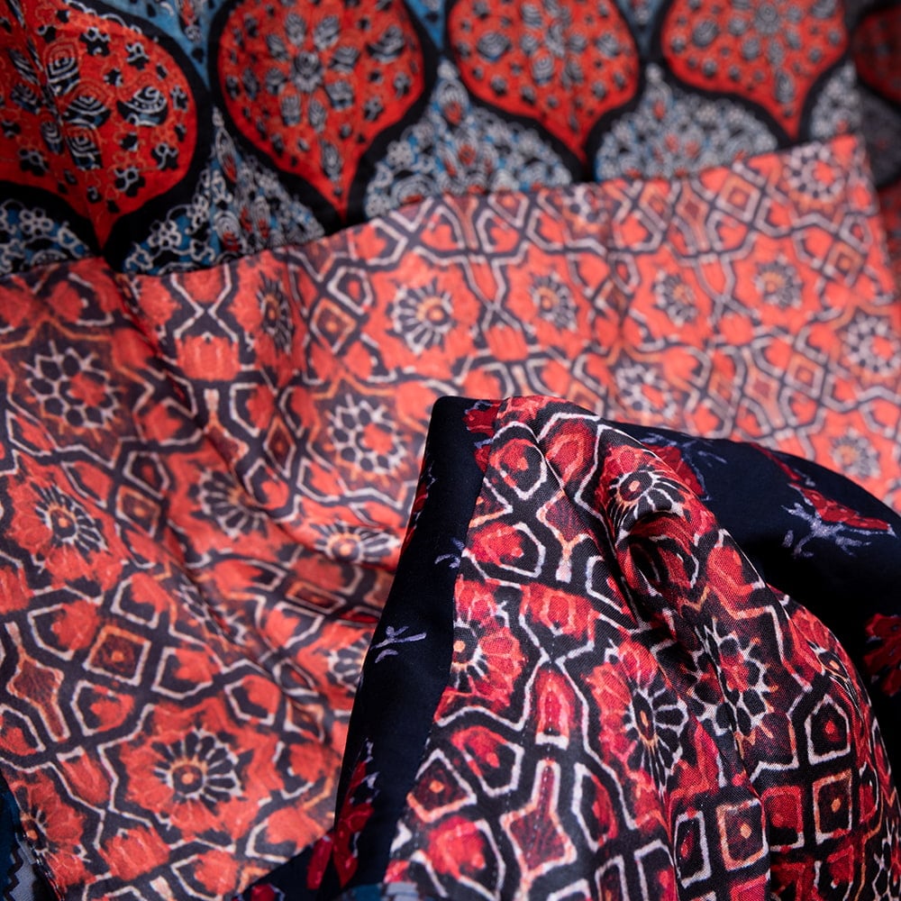 パキスタン・シンドからインドグジャラートにかけて発達したアジュラック布。その歴史は4000年以上とも言われています。インダス文明最大級の都市遺跡モヘンジョダロ(パキスタン)からは、ジュラックに関する遺物が発見されており、歴史の深さが伺えます。イスラム文化の影響を受けた柄は、幾何学的な模様が繰り返されとても神秘的です。