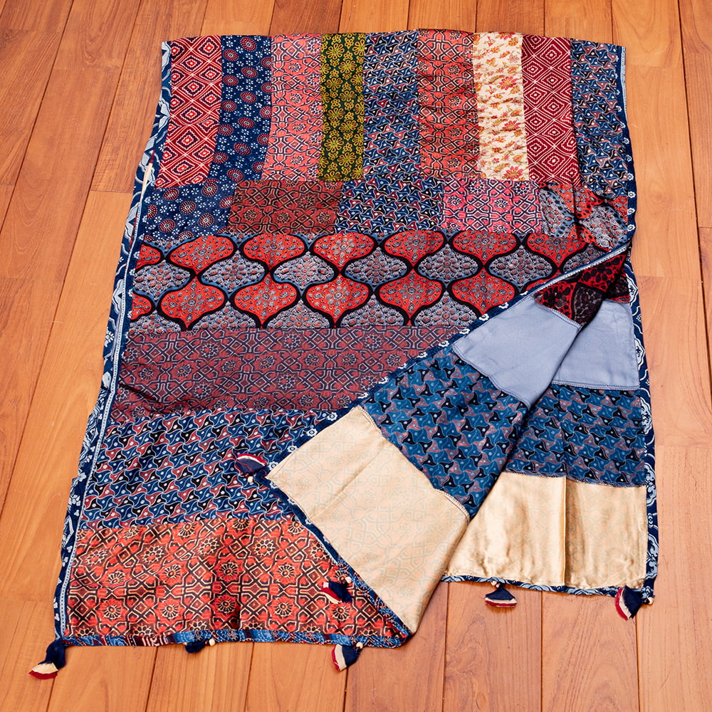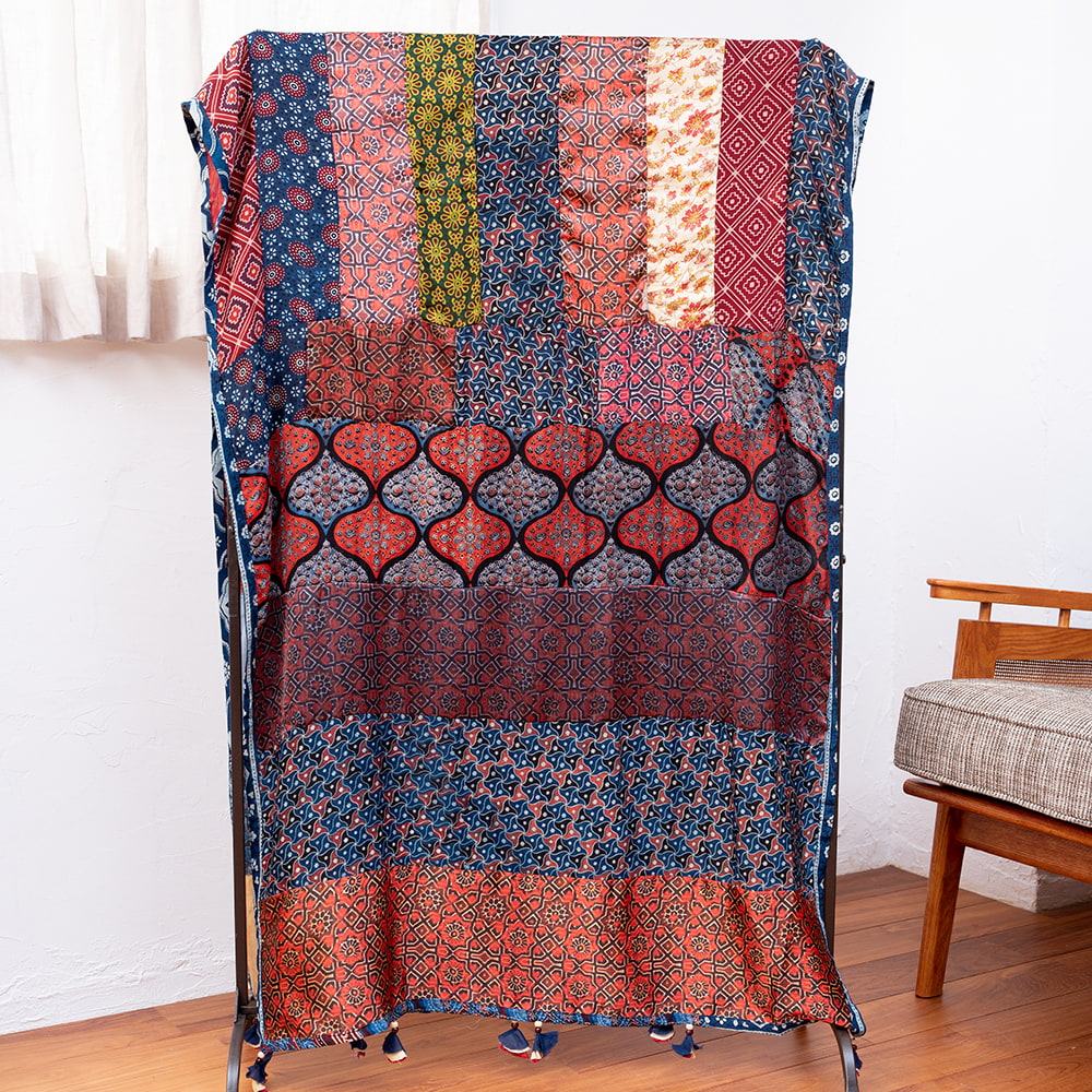 アジュラックプリントやカラフルな生地を組み合わせてできたドゥパッタはすべて1点もの。生地職人がまっさらな生地にアジュラックプリントを施し、美しい生地を完成させます。出来上がった生地は縫製職人に渡り、手作業でパッチワークを作り上げています。トーンを抑えた色味、真ん中を中心に左右対称に配置された柄のおかげで、見た目よりもコーディネートしやすく使いやすいです。