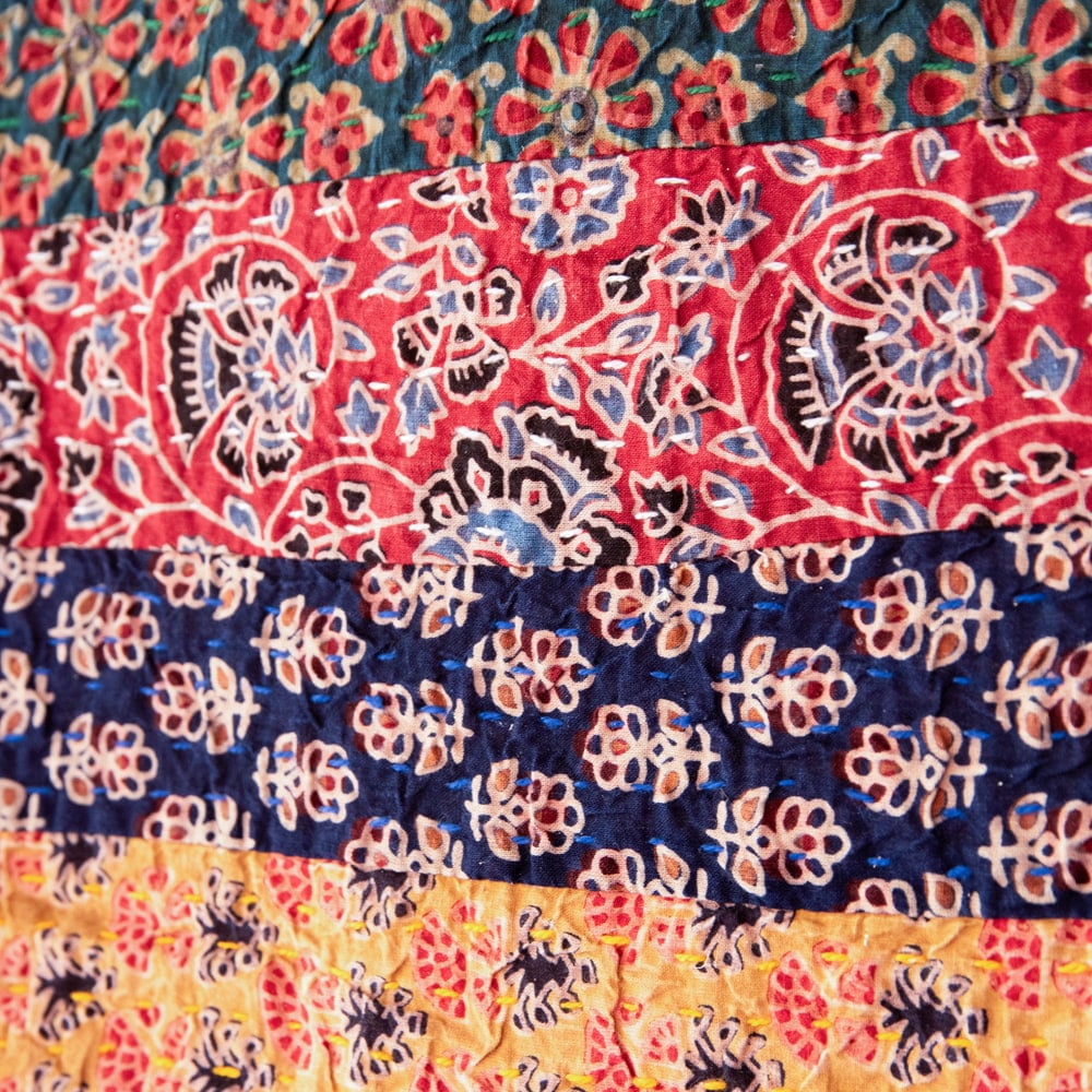 カンタ刺繍部分をアップにしてみました。インドらしいウッドブロックプリントを用いています