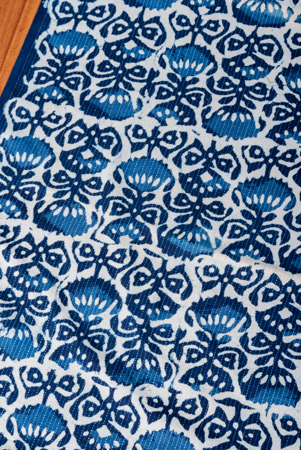 〔1m単位切り売り〕インドの伝統の泥染め(ダブプリント) 藍染め カンタ刺繍布の組み合わせ おしゃれ 生地 テーブルクロス 刺繍素材などへ〔幅約108cm〕 - ネイビー系