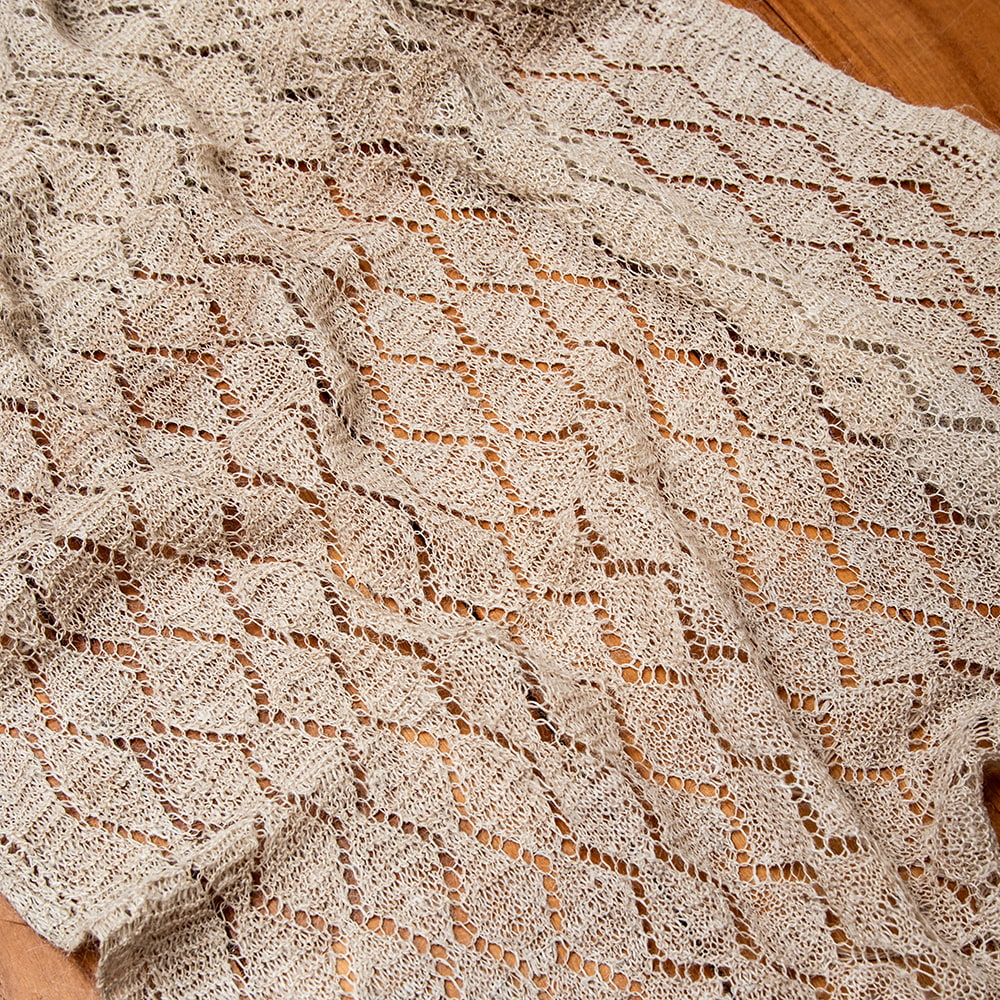 質感は、日本のからむし織にも近いけど、もう少しウールのような温かさや毛羽立ちもあり、ですがそれが嫌な感じでなく本当にさらりとここちよく、季節問わず年中使えそうです。身体に添いやすく柔軟性があり、巻いたり引っ掛けたりしやすくてすごく使い心地が良かったです。織り柄が綺麗で何度も眺めて幸せな気持ちになりました。色味もナチュラルなので若い方もマダムにも似合うような長く使えるショールですね。