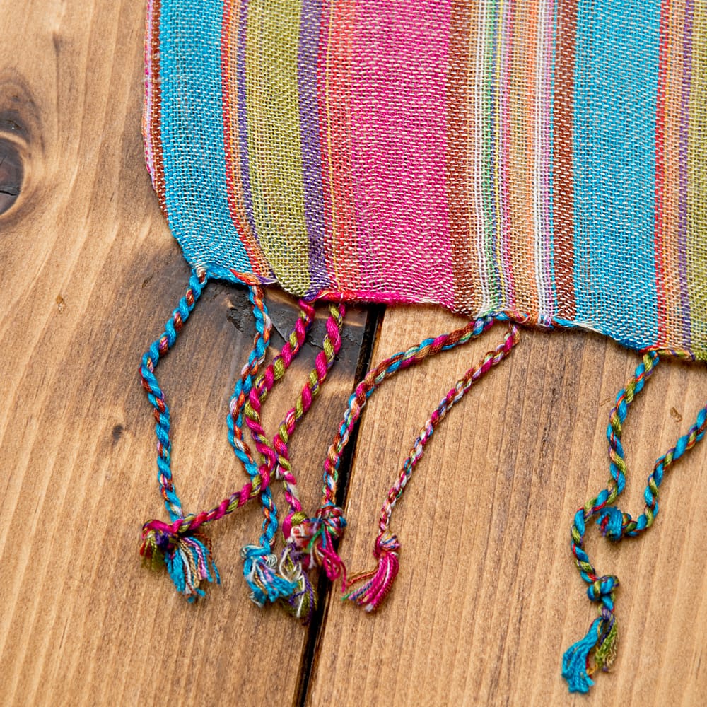 伝統あるインドのコットン生地をカラフルに織り込んだスカーフサイズの布です。色彩感覚豊かなインドらしく、綺麗な配色がとてもキレイです!生地は柔らかく薄手で、ストールとして少し肌寒い季節や、冷房が効きすぎた室内、また日差しよけとして等、様々なシーンで活躍してくれそうです!