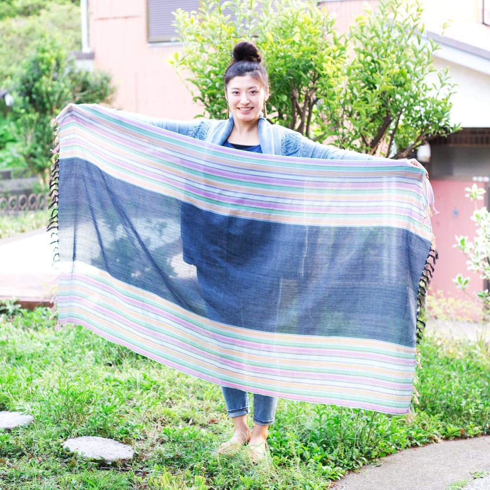 インドの聖地バラナシから、インドの人たちが腰巻きに使用しているおしゃれなコットン製のボーダールンギーが届きました! 色鮮やかなインドの色彩にボーダーがかわいくて当店でも大人気。布の端もおしゃれに細かく縛ってあります。インド綿なので軽やかで滑らかな手触りが心地よく、思わず何枚も揃えたくなる布です!色彩感覚豊かなインドらしく、綺麗な配色で多くの色合いがあるので、色次第で季節感も出せる一枚です。決して派手すぎないパステルカラー寄りの明るい色合いなのも春先などにぴったりですね。大きさは全部広げると身体がすっぽり隠れるくらいの大判サイズ。ふんわりした布なので、くるくるとストールとして使っても心地良いです。