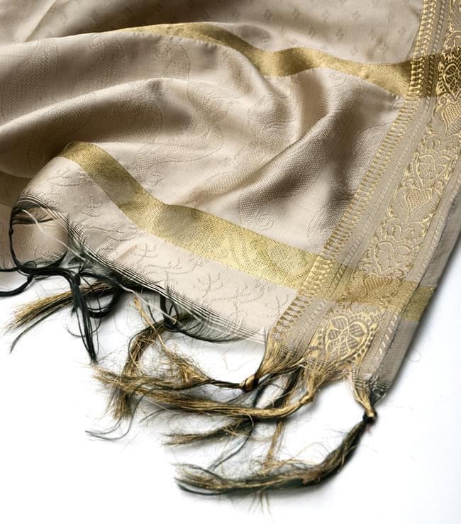 スカーフの縁にはサリーで使われるボーダーがあしらわれ、金色のアクセントになっています。
