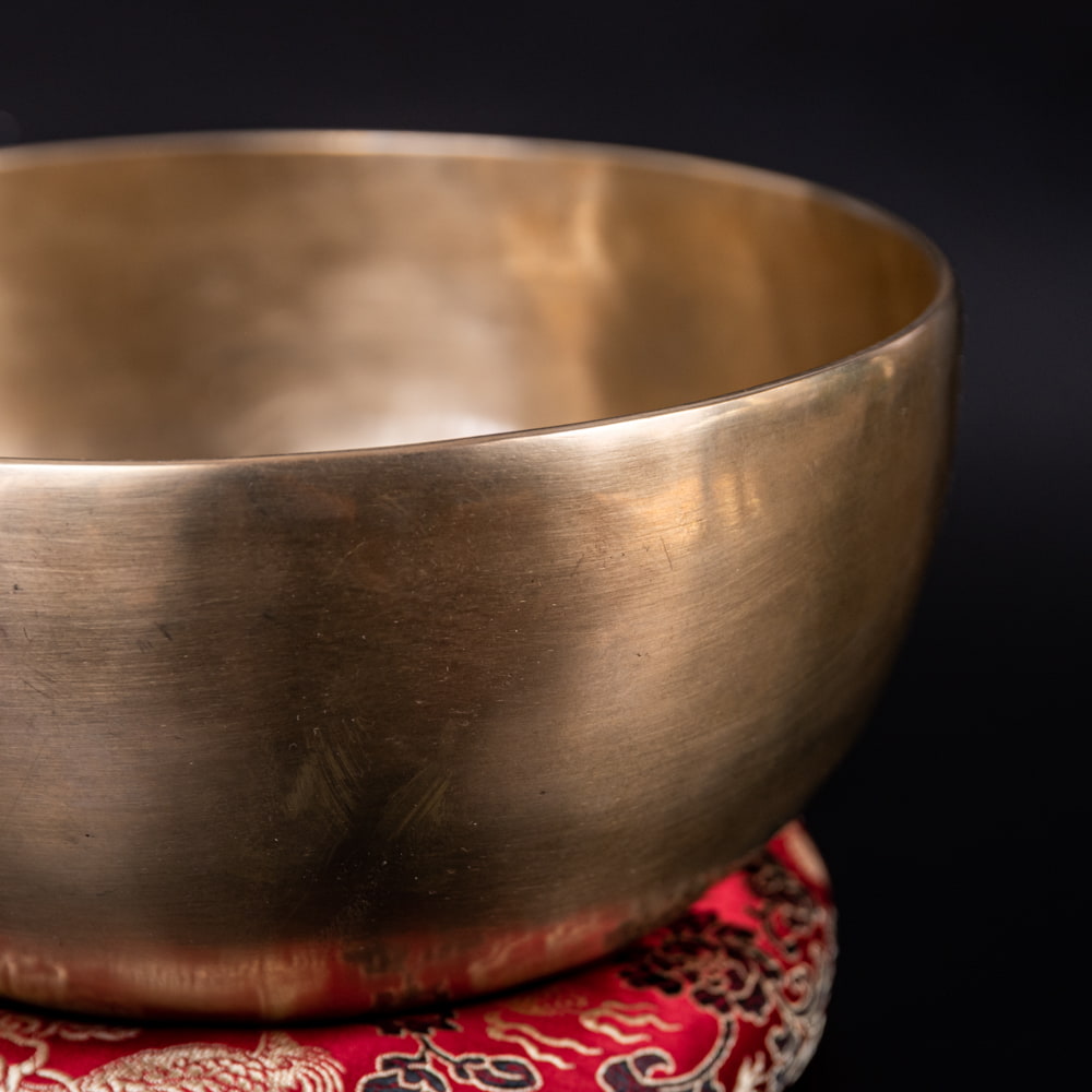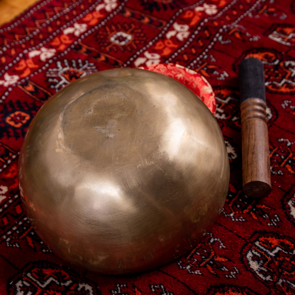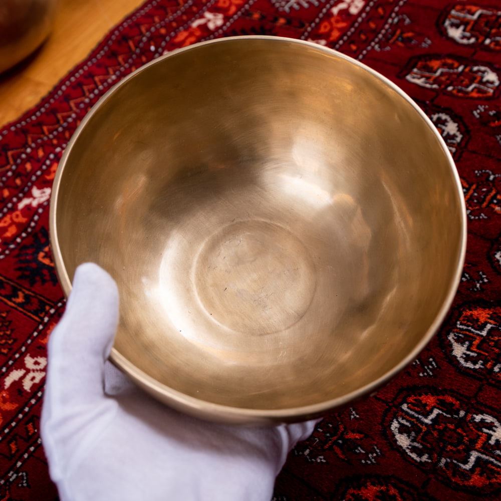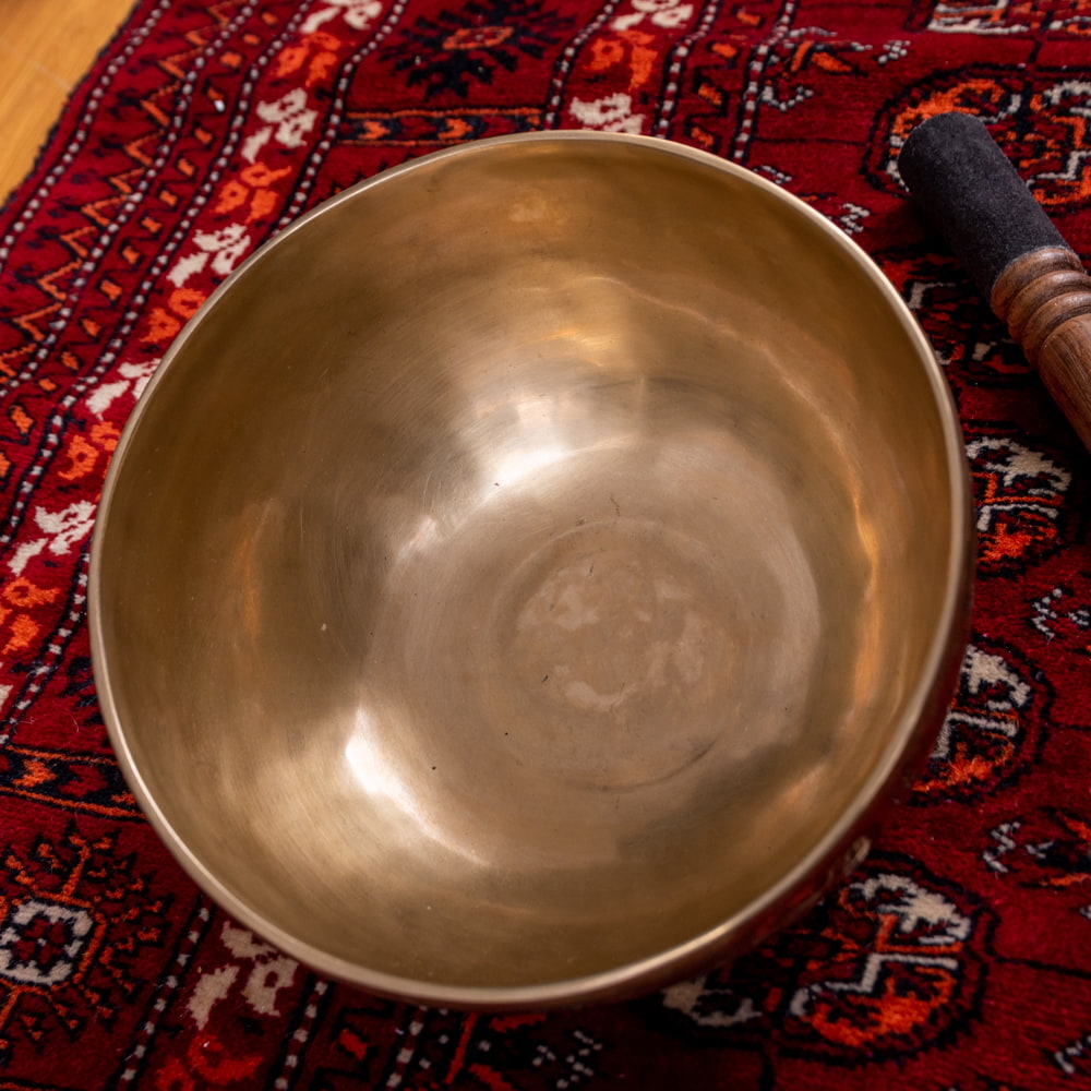 ずっと憧れていた、21cmほどの大きなシンギングボウルをこちらで買わせていただきました。一点もののアンティックということで、歴史を感じながら大切に使わせていただいています。フェルトスティックも同時に購入したので、付属のスティックと使い分けることで、異なる音色を楽しんでいます。部屋に置くと深みのある黄金の輝きを放っていて、存在感があります。粗末に扱うことはできないなと感じます。歴史を感じます。別売りの大きなフェルトスティックで叩くとポーン、という低い、いい音がします。付属の硬めのスティックで叩くと、カーン、というような、お寺などで聞くようなあの金属的な音がしました。響きの余韻が長く、叩いた後顔の目の前にボウルを近づけると、音を大きく感じ、深い響きを感じられます。いつ音が消えるのかと耳をすましている間に心が無になって落ち着いてきます。いつかYouTubeで見た、シンギングボウルの振動を体に感じるネパールの治療法のようなものもやってみたかったので、横になって、お腹に乗せて鳴らして、振動を感じて楽しんだりしています。変わった音楽を作ったりもするので、そっちでも活用していきたいです。この度はいいものとの出会いをありがとうございました。一生物だと思うので、大切にしていきます。
