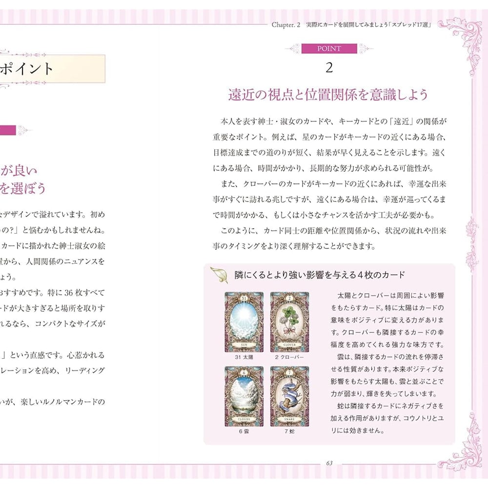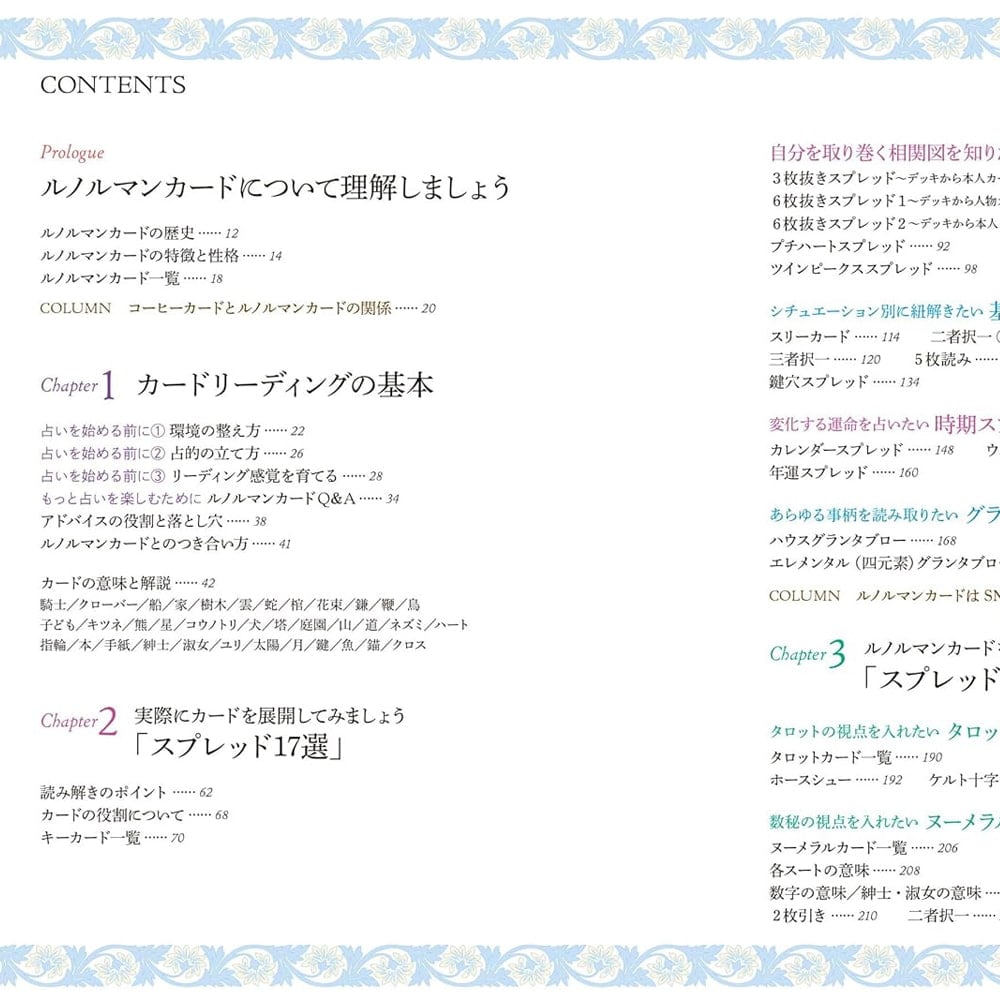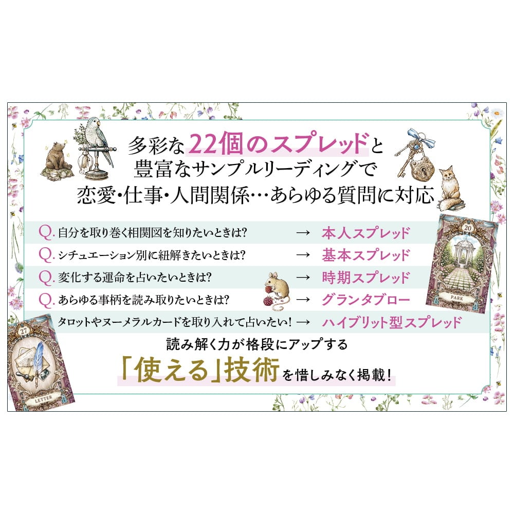 ルノルマンカードの特徴でもある「本人カード」を用いた、 自分を取り巻く相関図がわかるスプレッドや、 変化する運命を占う、週・月・年ごとの時期読みスプレッド、 タロットカードや数秘術のエッセンスが含まれたヌーメラルカードと 掛け合わせて占うハイブリッドなスプレッドなど、 初公開のオリジナルを含めた22個の展開法をご紹介します。