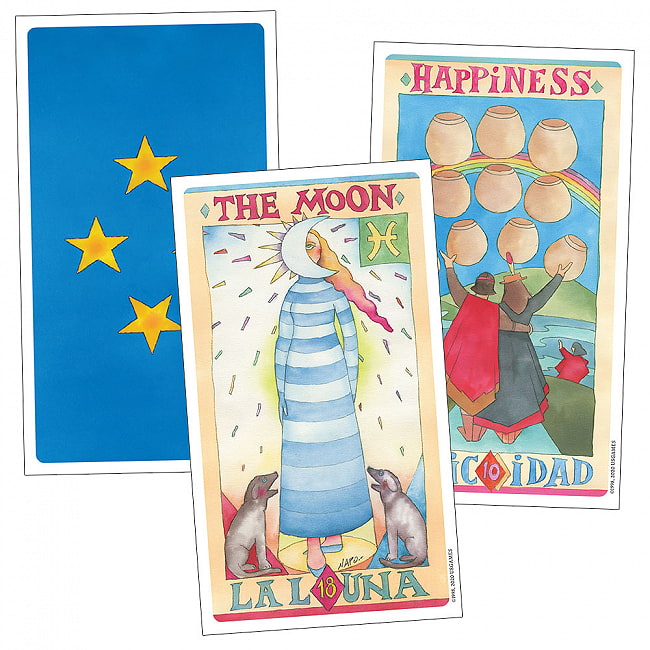 現在発売されているタロットカードは、海外文化の発祥ということもありヨーロッパやアメリカ等の海外の製作がほとんどです。そのため英語版の解説書が付いている物が多いです。タロットカード78枚の構成はほとんど変わることはなく、マルセイユ版やウェイト版などの起源製作者によって多少のカードの並び呼び名等が違うものもありますが、この78枚の構成はタロットカードと呼ばれるものに違いはあまりありません。占術の方法やカードの解説もほぼ共通していますので、オラクルカードのように英語が読めないから英語版では使えないということはほとんどなく、日本語の解説本と照らし合わせて使うことができますので、はじめての方やもっと詳しく知りたいという方は、日本語解説本と合わせてお求めになることをオススメいたします。