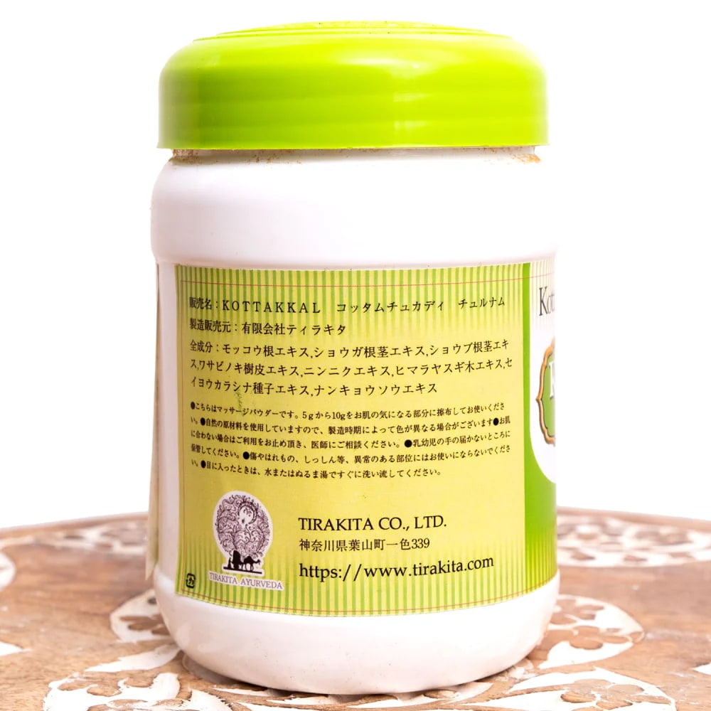 コッタムチュカディ チュルナムは、アーユルヴェーダの伝統に基づき調合されたハーブパウダーで、複数の植物素材をバランスよく配合した外用トリートメント用の製品です。ショウガ(Shunti)※1、ショウブ根※2、ワサビノキ※3などのハーブが含まれており、南インドでは長年にわたり使われてきました。