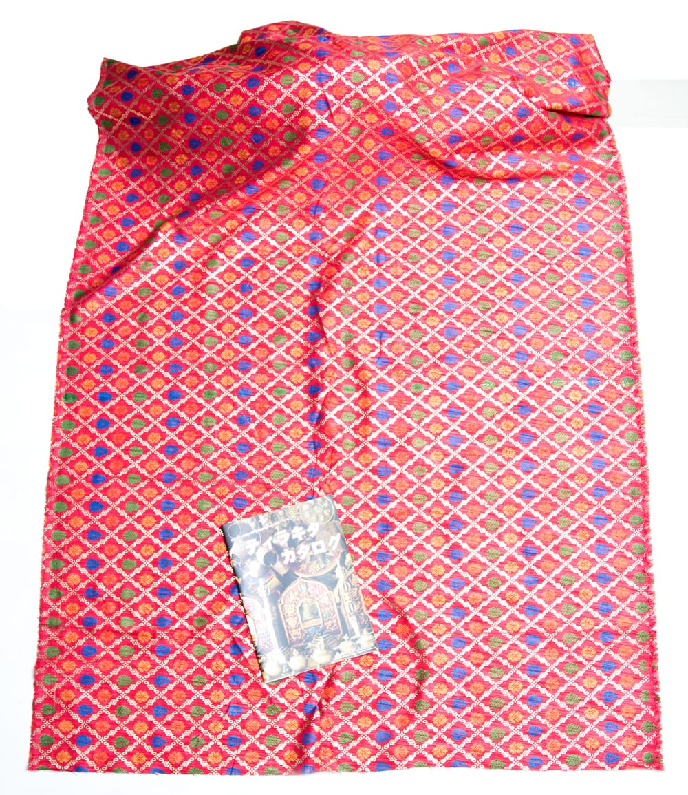 〔1m単位切り売り〕インドの伝統模様布〔幅約110cm〕 赤系の商品写真 5枚目 布を広げてみたところです。横幅もしっかり大きなサイズ。布の上に置かれているのはサイズ比較用の当店A4サイズカタログです。