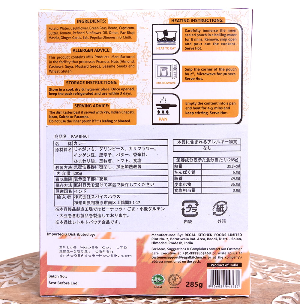 【送料無料・15個セット】パブ バジ - PAV BHAJI 2人前 285g【Regal Kitchen】 通販店