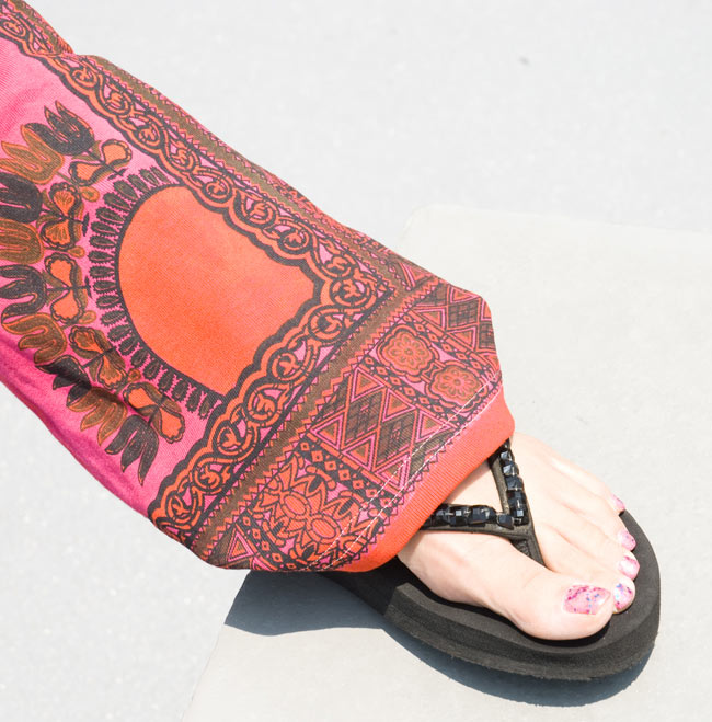 美脚効果あり!のすっきりスリムなブーツカットパンツがタイからやって来ました!股上も浅めで、腰回りはしっかりフィット。太ももから膝までもしっかりスリムで、膝下はちょっとフレアになっているブーツカットなデザインです。全体的にエキゾチックなエスニック柄がプリントされていて、とっても可愛いです。子供っぽくなり過ぎない、大人エスニックな格好にピッタリですね。