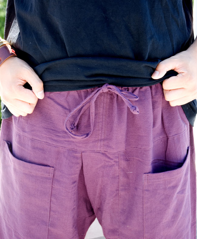 ウエストはゴムと紐で調整します。股の部分が交差したようなデザインになっていて、まさにタイパンツのよう。