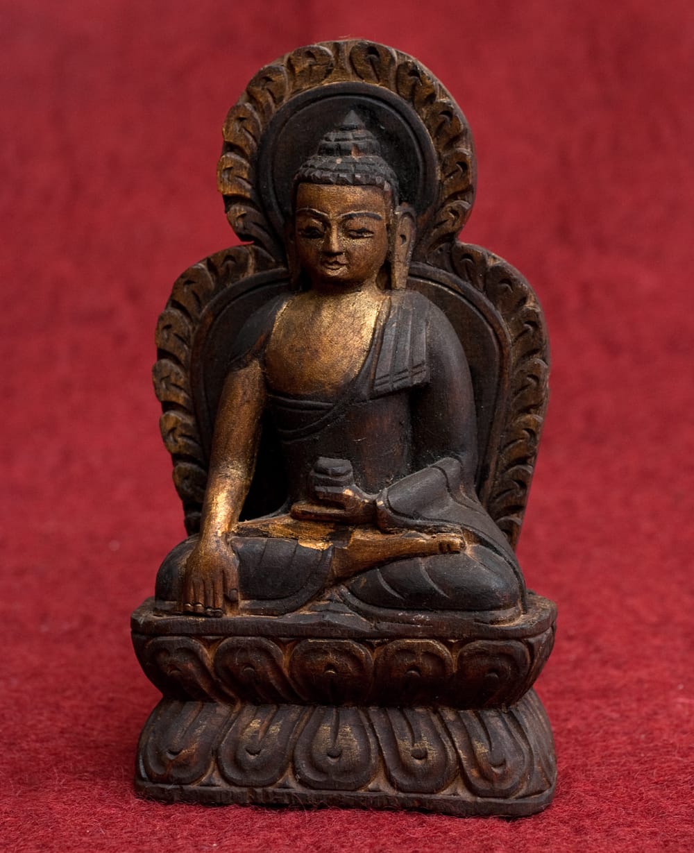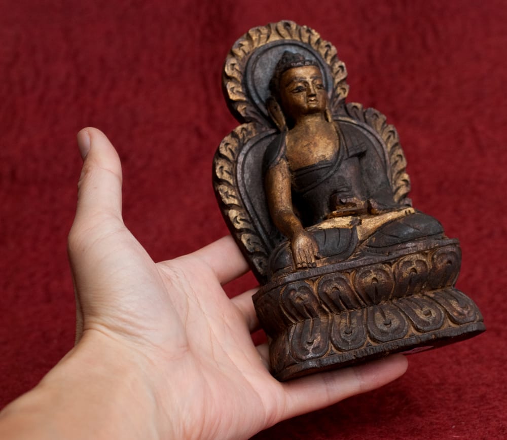 | 備考 | ネパールの仏教徒が、天然の木から一刀一刀掘り出して制作した一点ものの仏像です。天然木のため、多少の割れ等がある場合があります。 まれに裏面についている赤い蝋は、ネパールの考古学局の輸出許可シールの名残です。 |