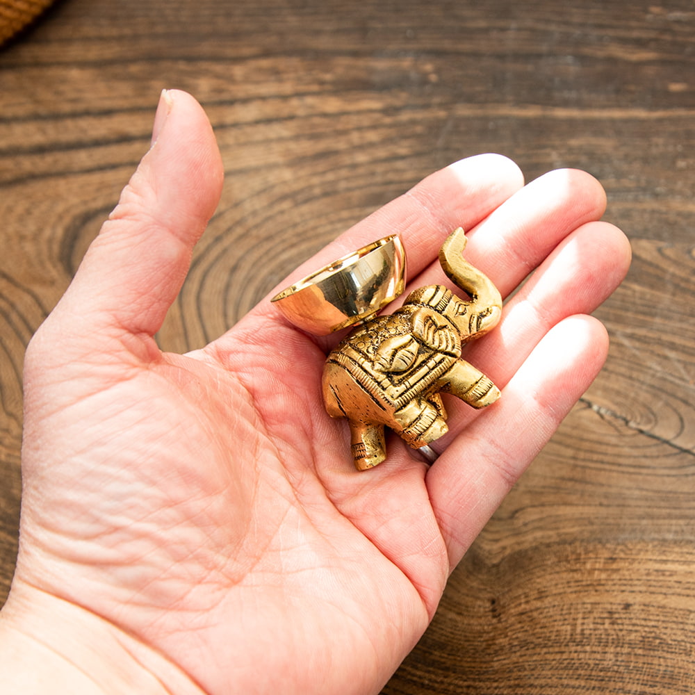 こちらはそんな象さんをブラスで綺麗に装飾したものです。作りは本格的で、古来より仏像製作に使われてきたブラス製で作られているため、実際の重量より重厚感を感じられます。ブラスの輝きと細かく彫刻された細工にきっとご満足いただけると思います。■小さなボウルつき