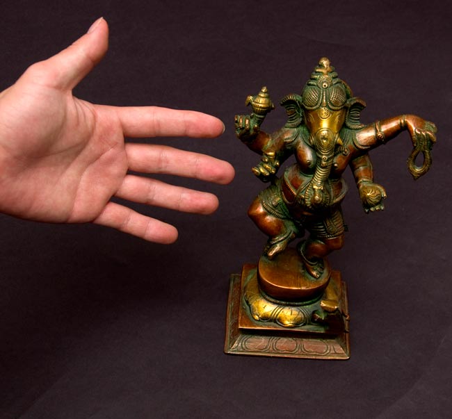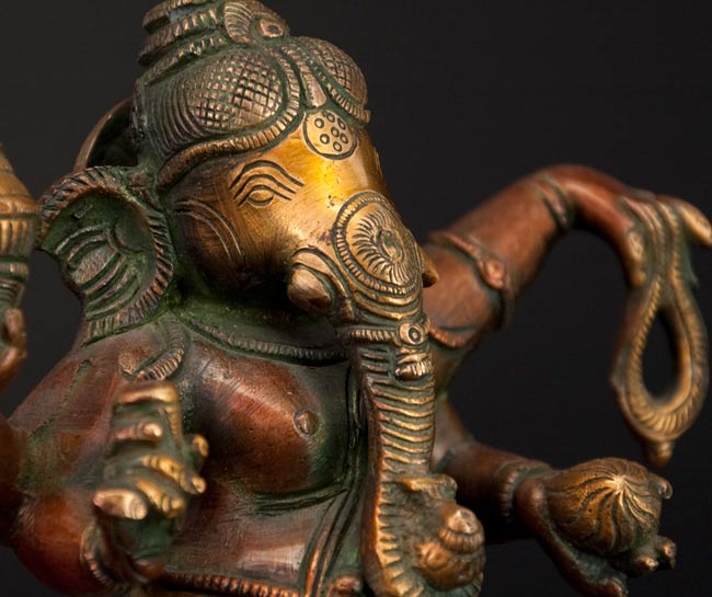 金属ですので重厚感たっぷりですが、実際の重量は2から3Kgですので片手で持ち上げられます。このガネーシャはインドの遺跡でも発見されるような伝統的な姿をしています。商売の神様として、ご利益がありそうです。見て飾って、きっとご満足いただけると思います。