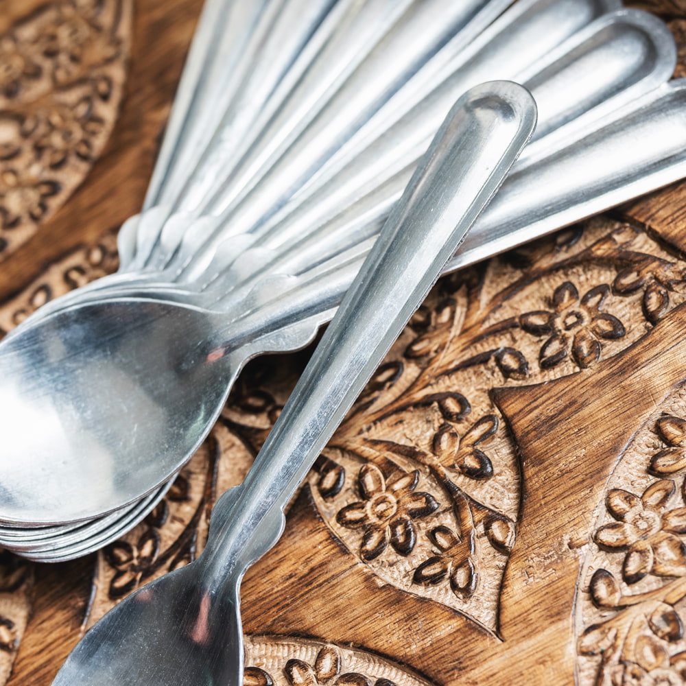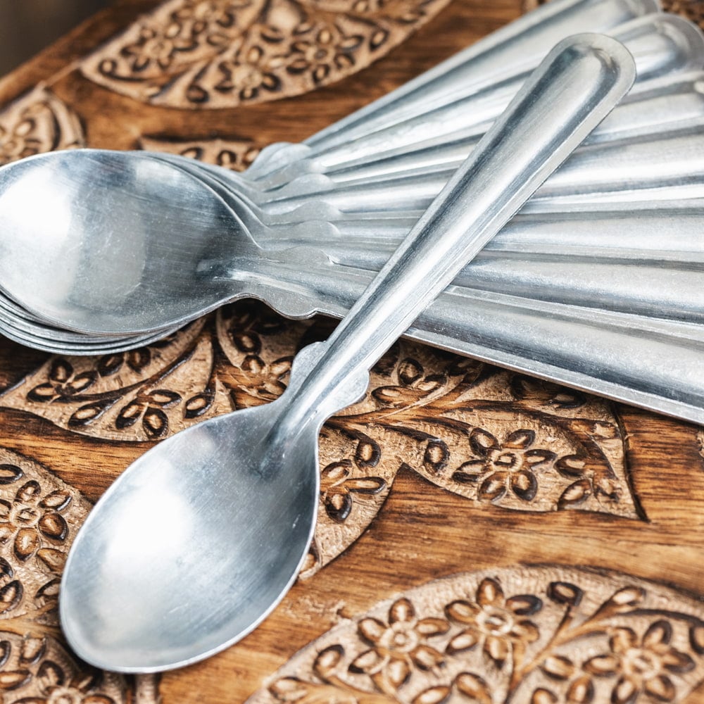 タイからやってきた、アルミニウム製のスプーンです。12個セットなので、1つのご注文につき12個ずつお送りいたします。作りは無骨な感じで、アンティーク感のあるテイスト。普通のスプーンにはない雰囲気があり、それが魅力になっています。また、アルミ製なのでとても軽量。サイズ感も使い勝手が良いです。