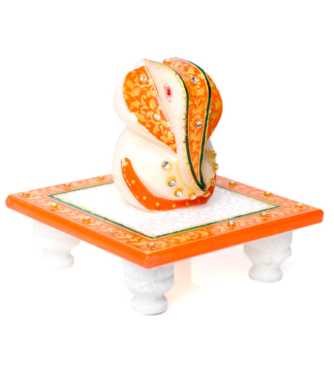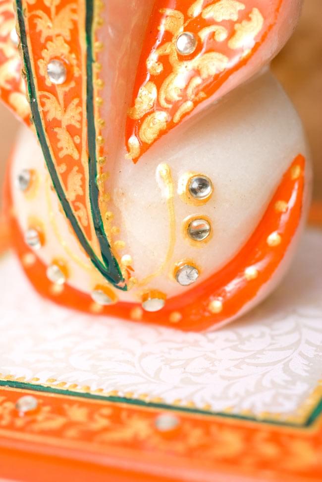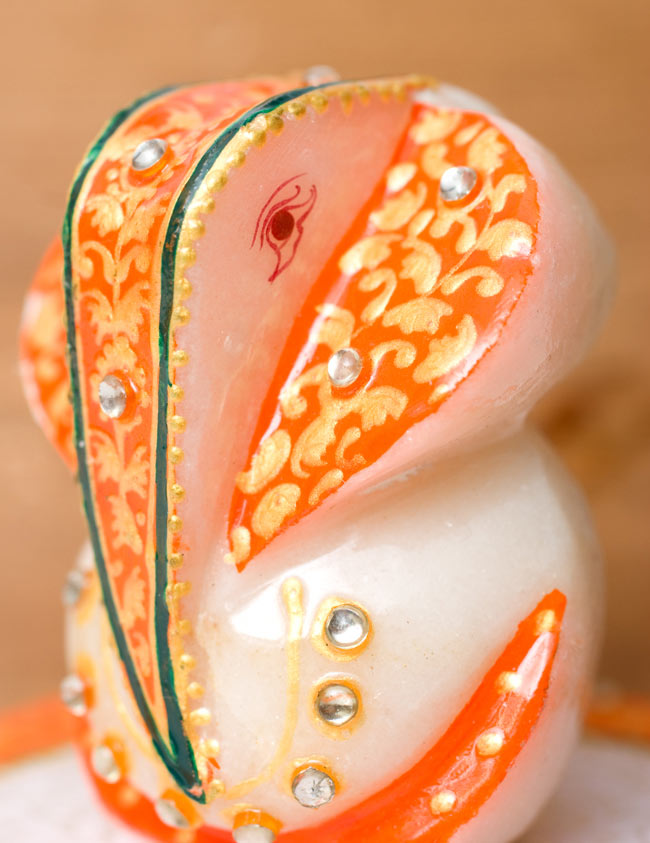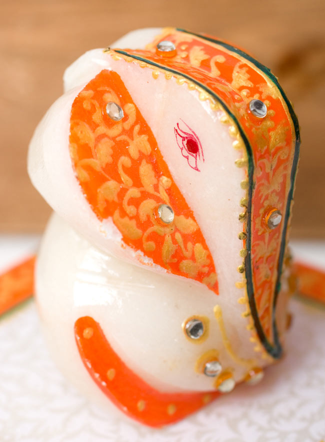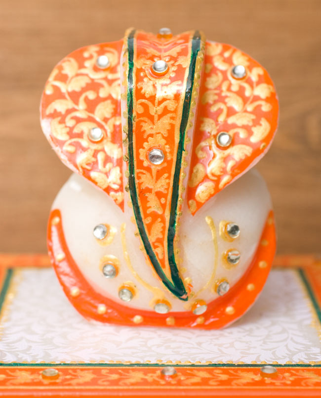 タージマハルと同じ素材、マーブルストーンを削りだして彫刻し、鮮やかな彩色を施したガネーシャです。台座にも美しい紋様が与えられ、眺めているだけでもうっとりとしたひとときをお過ごし頂けます。■金運と商売の神様