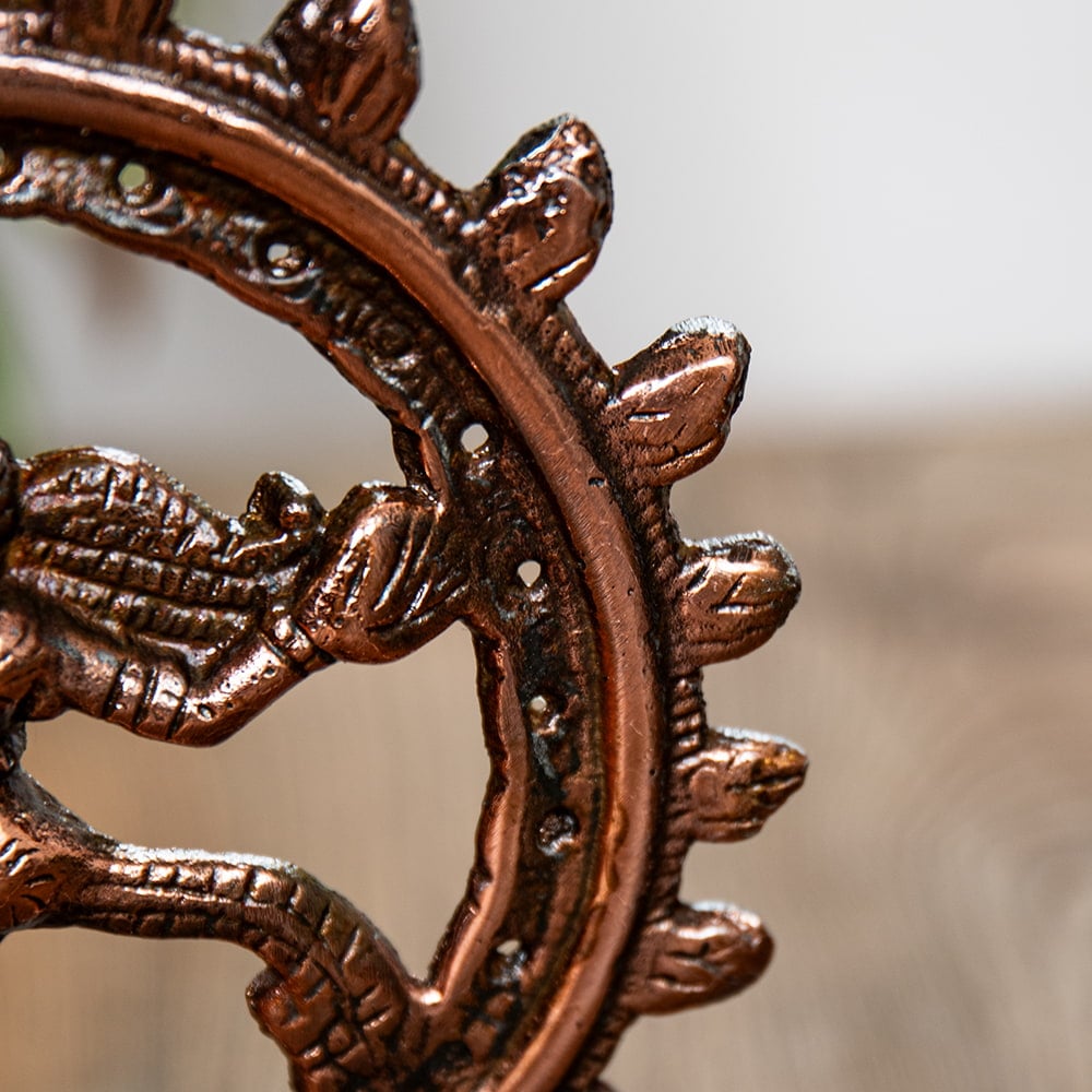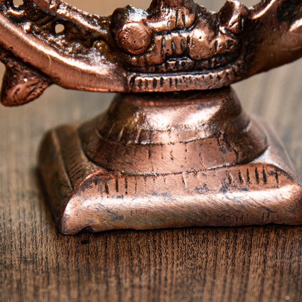 黒光りする重厚な雰囲気と、持ち運びしやすい重さが特徴の金属、ガンメタル製。重量とコスト削減のため、見えない部分は綺麗に削られています。その分、お値段も安く、お買い特なんですね。そんな裏面もインドらしい無骨な感じで味わい深いです。もちろん見える部分はしっかりと綺麗に作りこまれているので、部屋に飾ると存在感抜群!!レストランや雑貨屋のディスプレイとしてもお勧めです。満足いく大きさ、確かな細工で、きっとご満足いただける逸品です。
