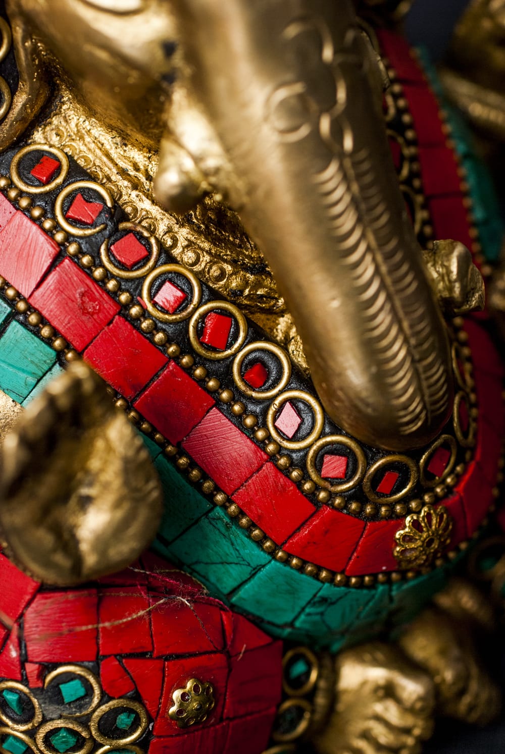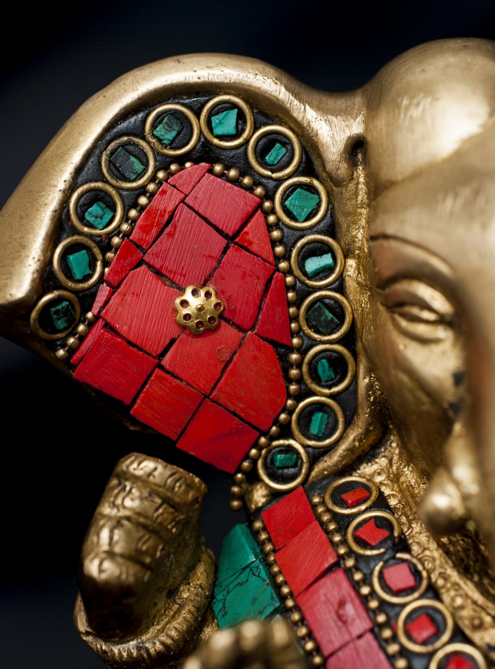 緑青石で美しく装飾されたガネーシャ像がインドから届きました。重厚な質感のあるブラスを素材に象られたガネーシャは存在感もたっぷり。インドの職人が心血を注ぎ、石を小さく刻んで埋め込んだ極めつけの仕上がり。像そのものの造形も奥深く、見るたびに細部に新たな発見のある芸術的な逸品です。■学問・金運の神様 ガネーシャ