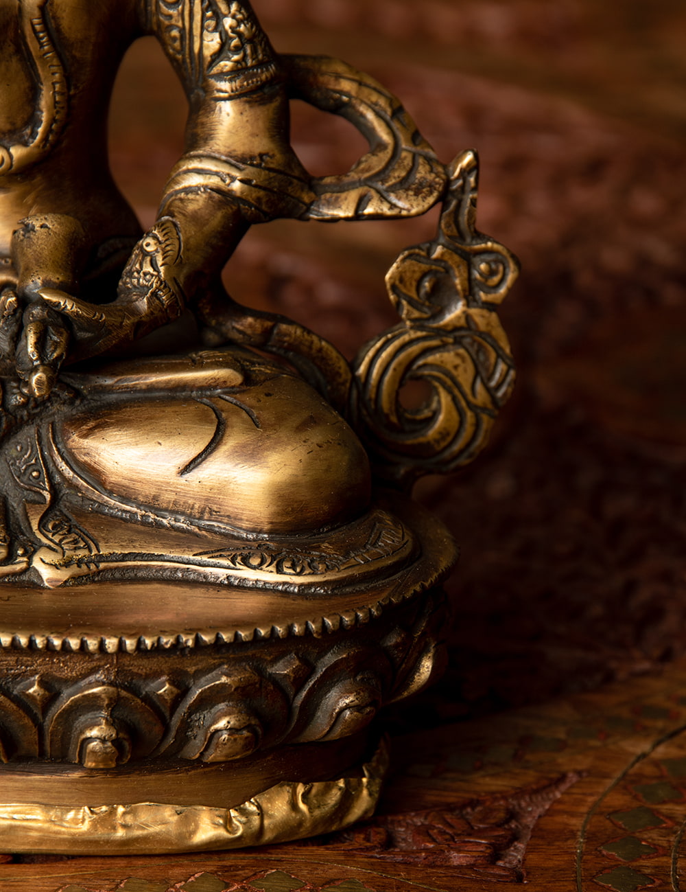 チベット仏教においては金剛薩た(こんごうさった)は本初仏(原初の仏、すべての仏の母体としての究極の仏)の一仏とされています。右手にはヴァジュラ、左手にはガンターを持つ姿で表現されます。金剛と訳されたヴァジュラは固いもの・揺るぎないもの・真理を意味します。金剛薩たのマントラにはすべての悪行を清める力があるとされています。■耐久性抜群のブラス製