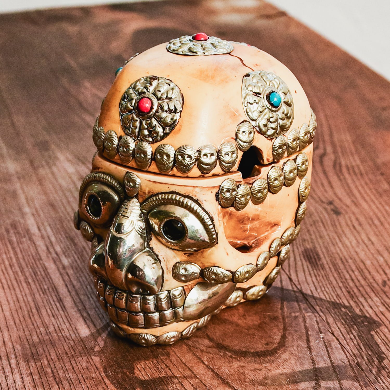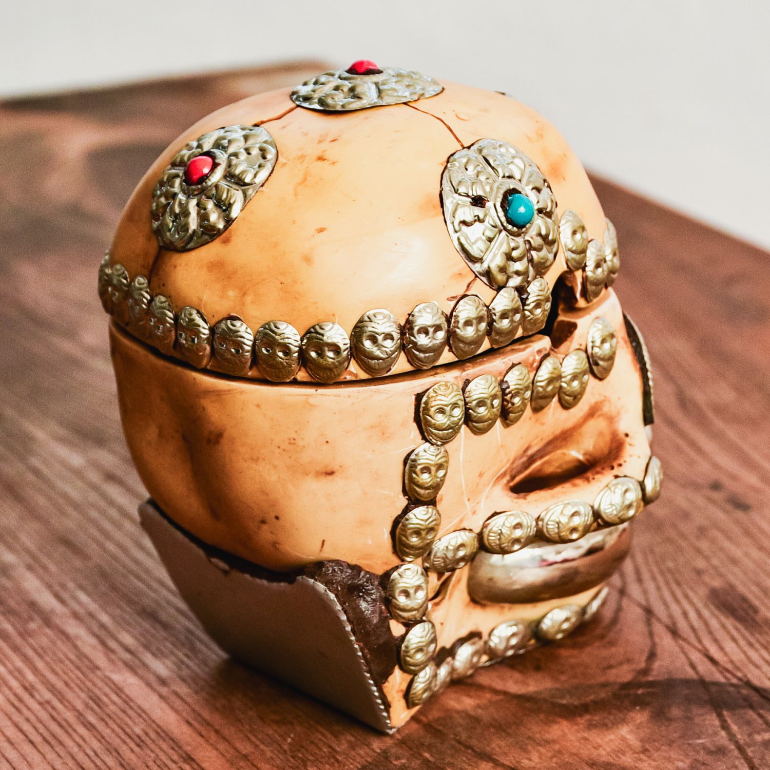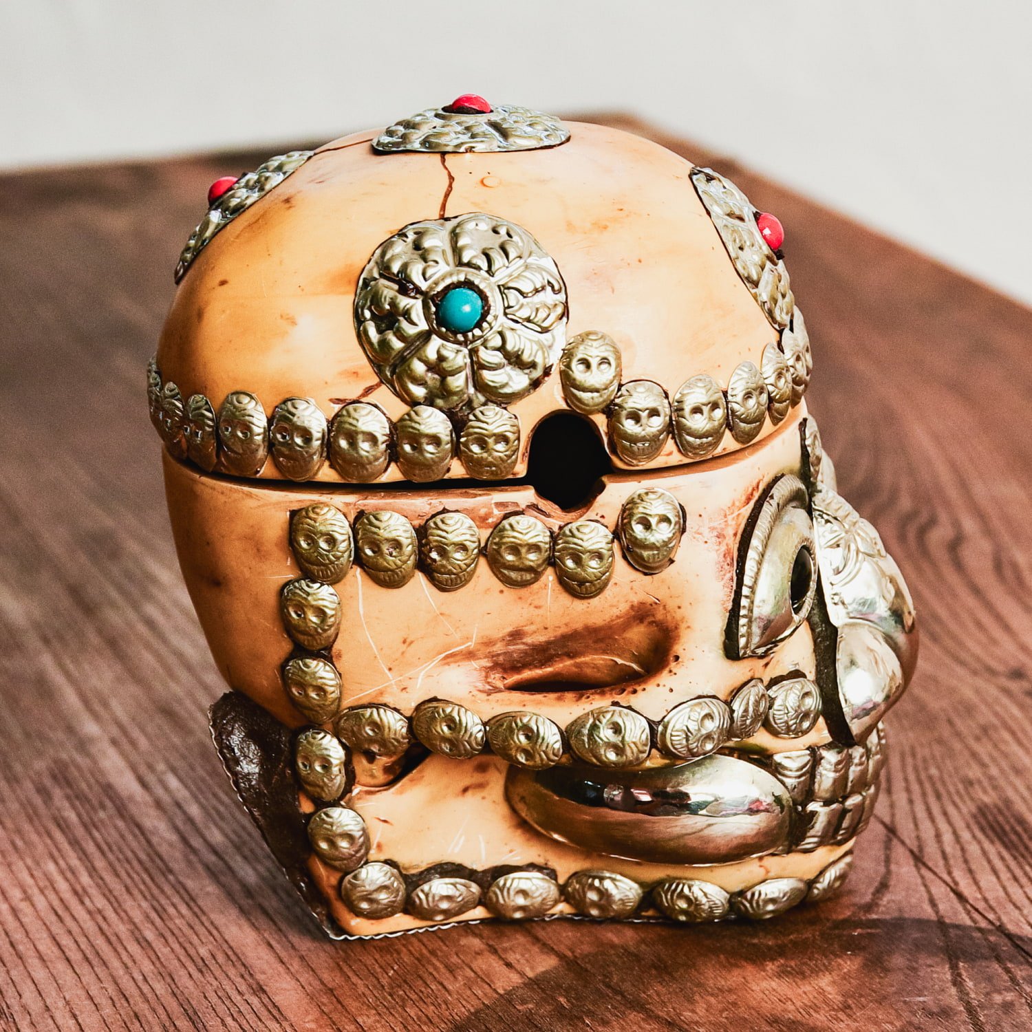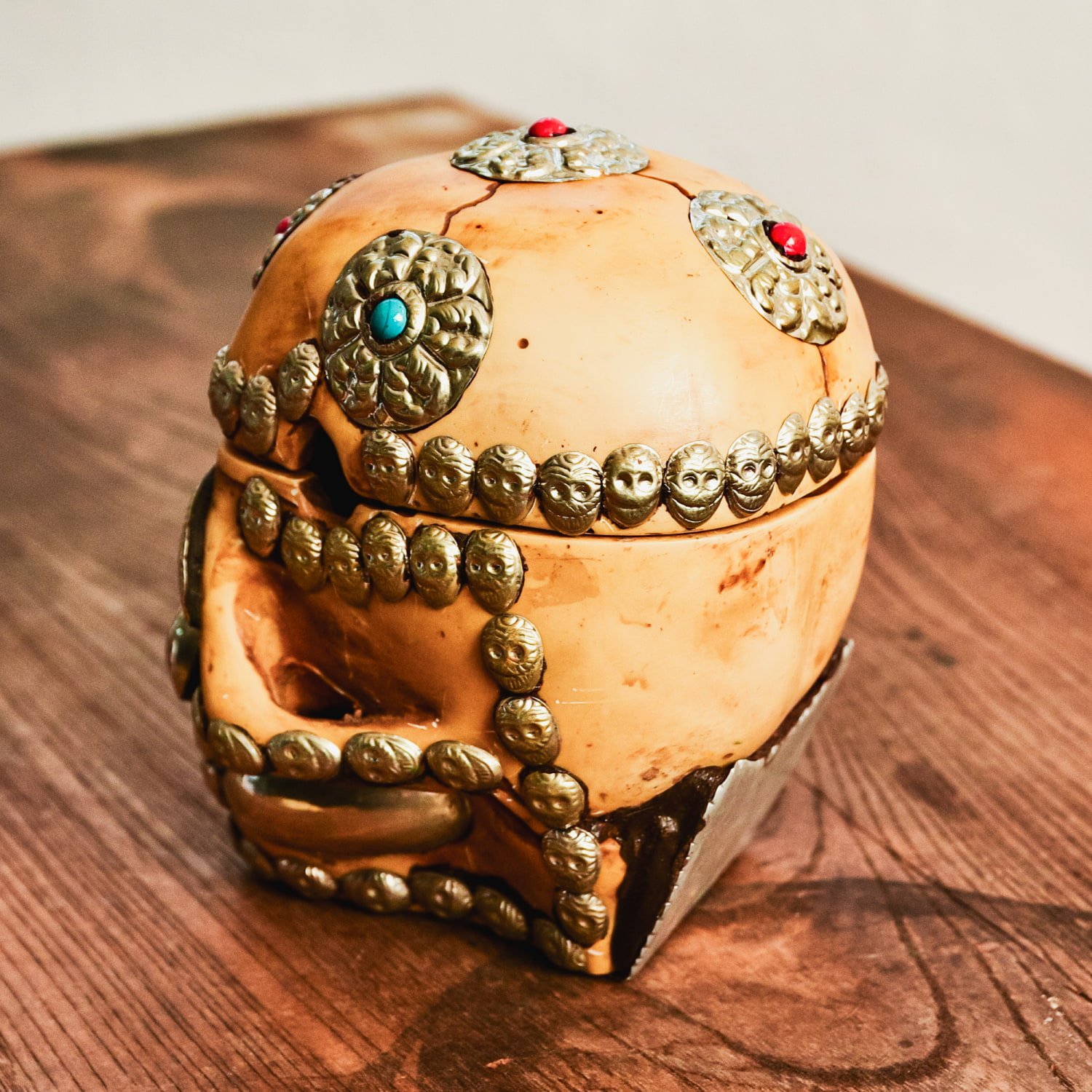 本物のカパーラは高層の頭蓋骨から作られますが、こちらはレジンと言う樹脂で作られております。頭蓋骨ではありませんので、ご安心ください。スカルの上部は蓋になっており、中にはちょっとしたものを入れておけます。横に丸い穴が空いているのでお香たてにも良さそうです。チベット文化に思いを馳せて、インテリアとして楽しんでくださいね。
