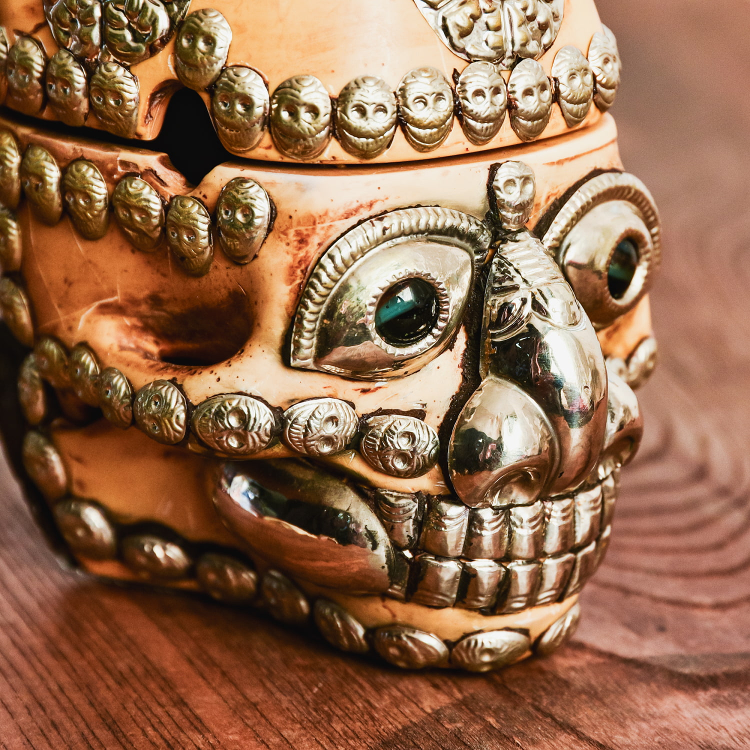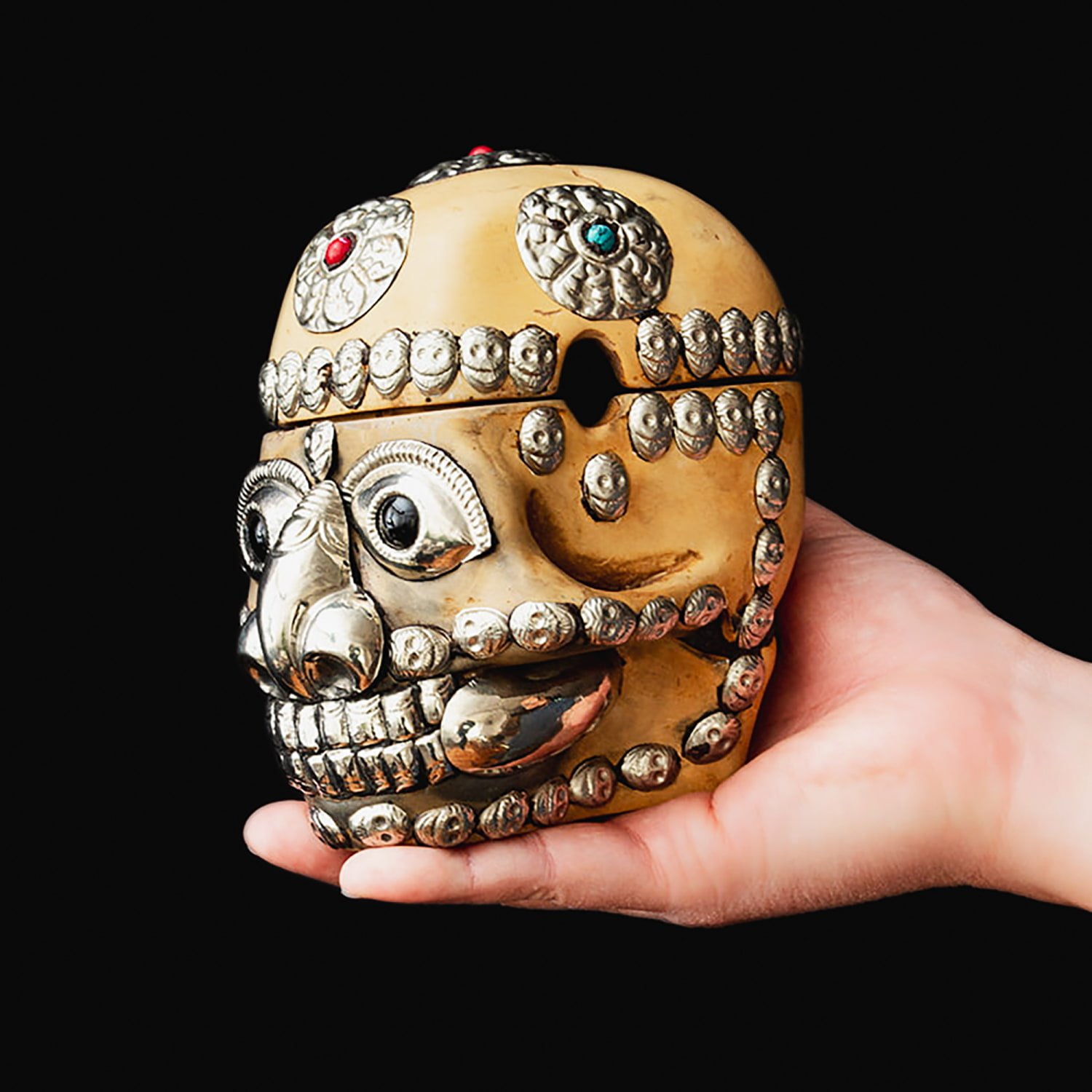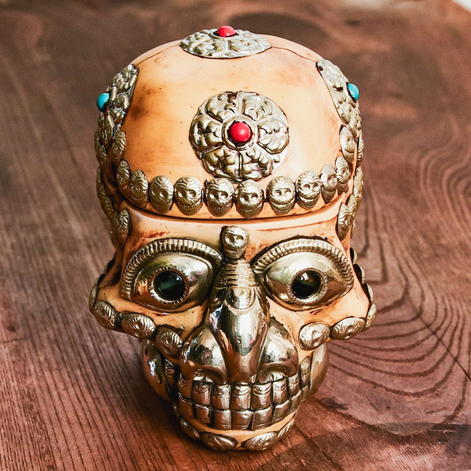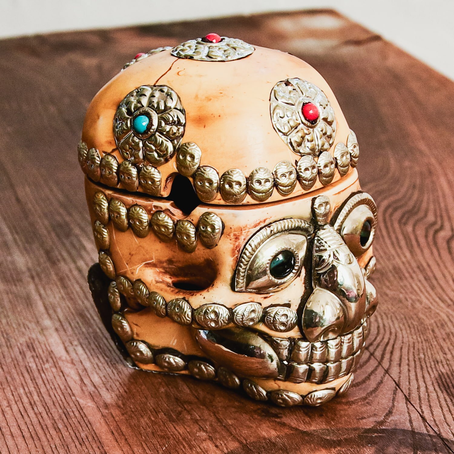 本物のカパーラは高層の頭蓋骨から作られますが、こちらはレジンと言う樹脂で作られております。頭蓋骨ではありませんので、ご安心ください。スカルの上部は蓋になっており、中にはちょっとしたものを入れておけます。横に丸い穴が空いているのでお香たてにも良さそうです。チベット文化に思いを馳せて、インテリアとして楽しんでくださいね。
