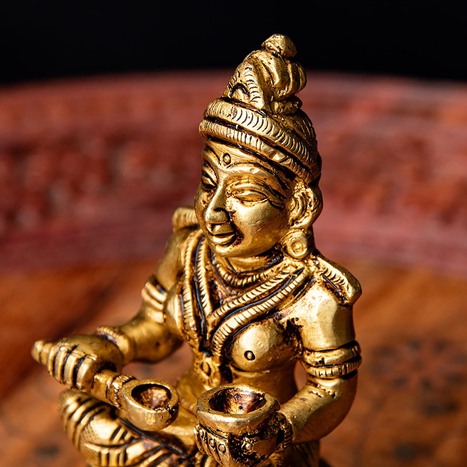 インド古典が特に有名なインド音楽ですが、実はインドには色々な種類の伝統音楽がインド各地に星のように点在しています。写真の人はバウルと呼ばれるカルカッタがあるベンガル地方の放浪吟遊詩人で、1弦や3弦の楽器を手に村や街を廻り、生計を立てている特別な人たちです。おもに野外で村人に囲まれて歌います。歌は、導師が弟子にバウルの哲学を教えるための教育媒介としても使われ、歌い手から歌い手へと、口頭で伝承されますアンナプルナー 女神像(食を与える女神) 重厚なブラス製 高さ10.5cm程度の同一カテゴリ商品