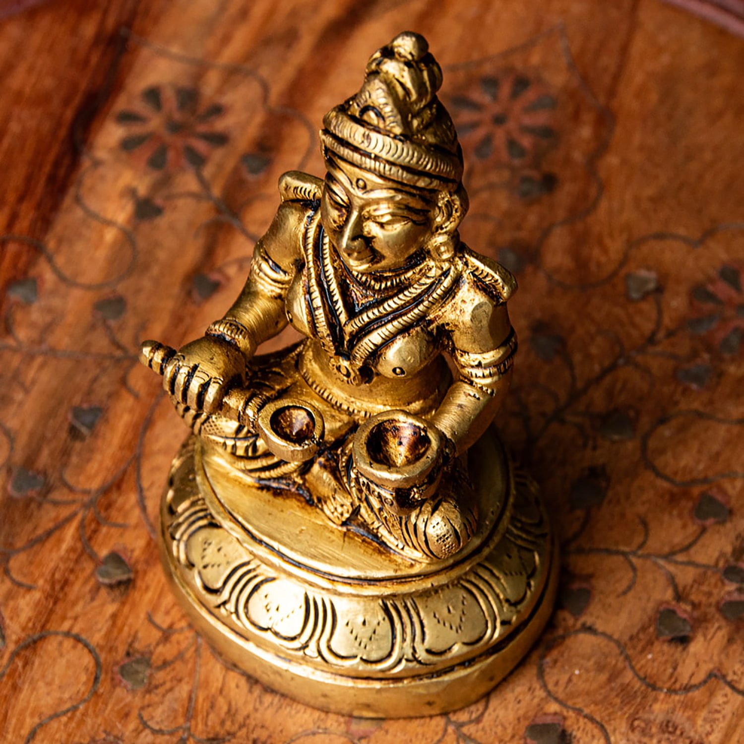 ある日、シヴァ神は「すべての物質的なものは幻(マーヤー)に過ぎない。食物もまた幻想だ」と語りました。これに怒った妻パールヴァティは姿を消してしまい、世界から食べ物も消え、飢饉が訪れました。 困り果てた神々や人々は食を求めましたが見つからず、ついにシヴァ自身もヴァーラーナシーで施しを乞うことになります。 そこでシヴァが目にしたのが アンナプルナーとしてのパールヴァティ。飢える人々に食を分け与えていました。アンナプルナーはシヴァにも施しを与え、シヴァは「霊的存在としての自分は飢えを超越していても、人間や信徒は食物なくして生きられない」と悟ったと伝えられています。とっても小さな神像ですが、料理づくりを愛する人、食事への感謝を忘れたくないひとにぜひオススメです。キッチンの大事なスペースに飾りたくなりますね。