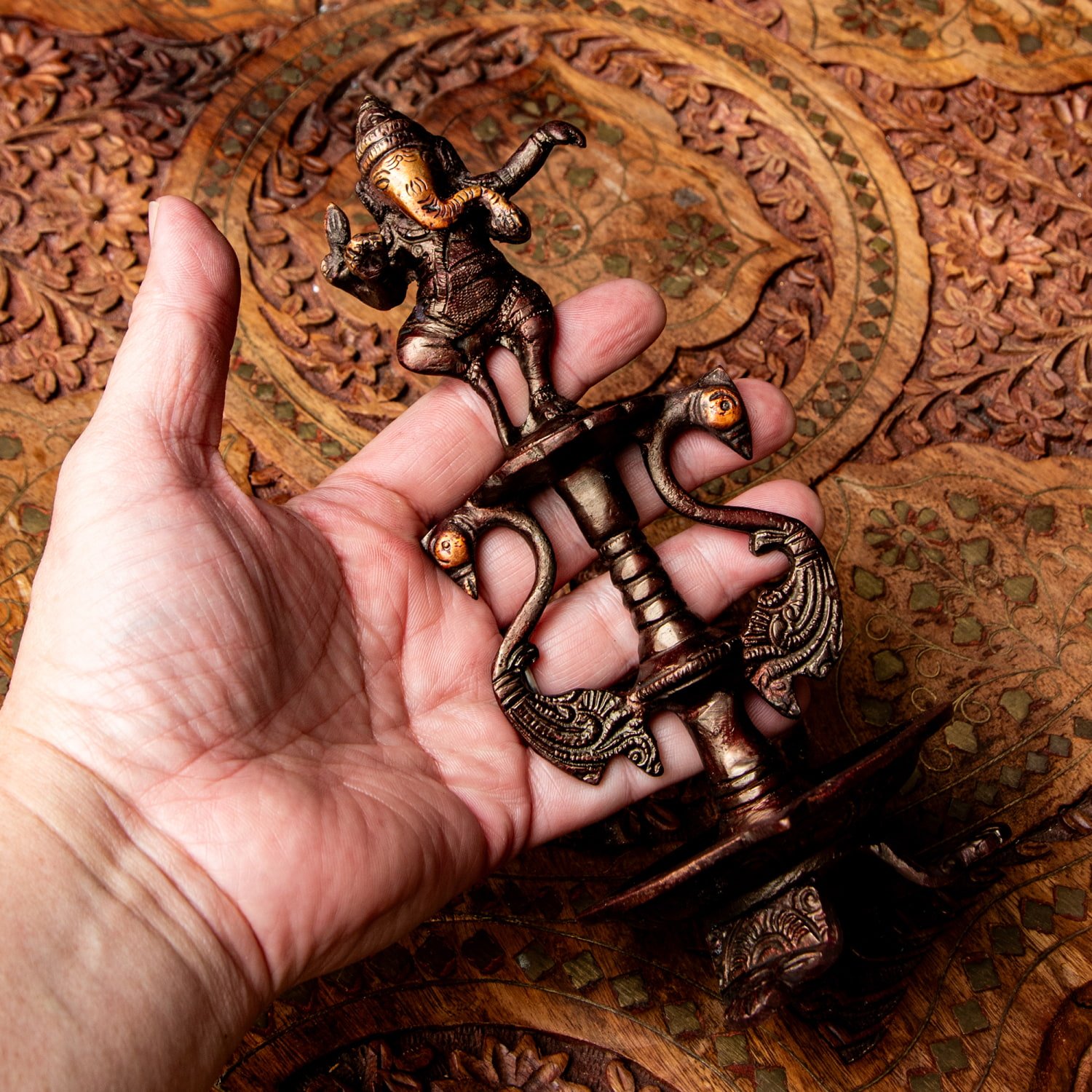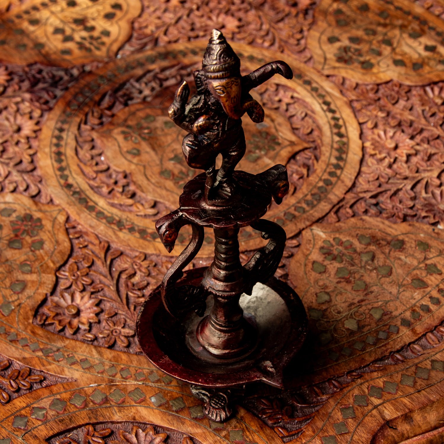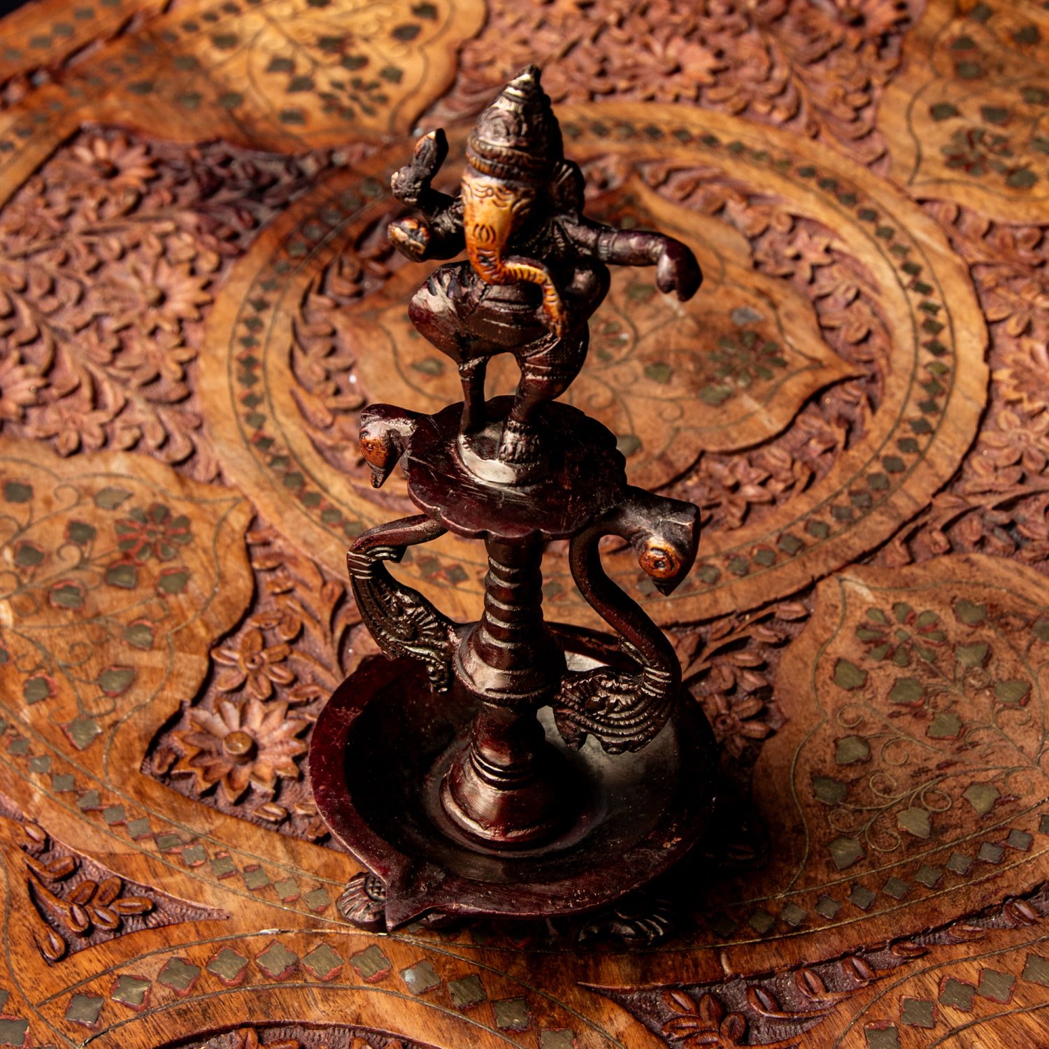楽器を奏でたり、踊ったり、本を読んだり書いたり、時にはリラックスして寝転がっていたり…多彩なお姿からはその人気ぶりが伺えます。世界一長い物語とも言われるインドの叙事詩『マハーバーラタ』を筆記したのもガネーシャ神だと語られます。音楽や踊りの舞台では、プログラムの最初にガネーシャに祈りを捧げる習慣があります。あらゆる障害を破壊し、願い事の成就へと導いて下さるガネーシャ神は、学問から商売繁盛まで幅広い分野のご利益で信仰され、インドのみならずタイなどの東南アジアでも人気を誇っているのです。| 素材 | ブラス |